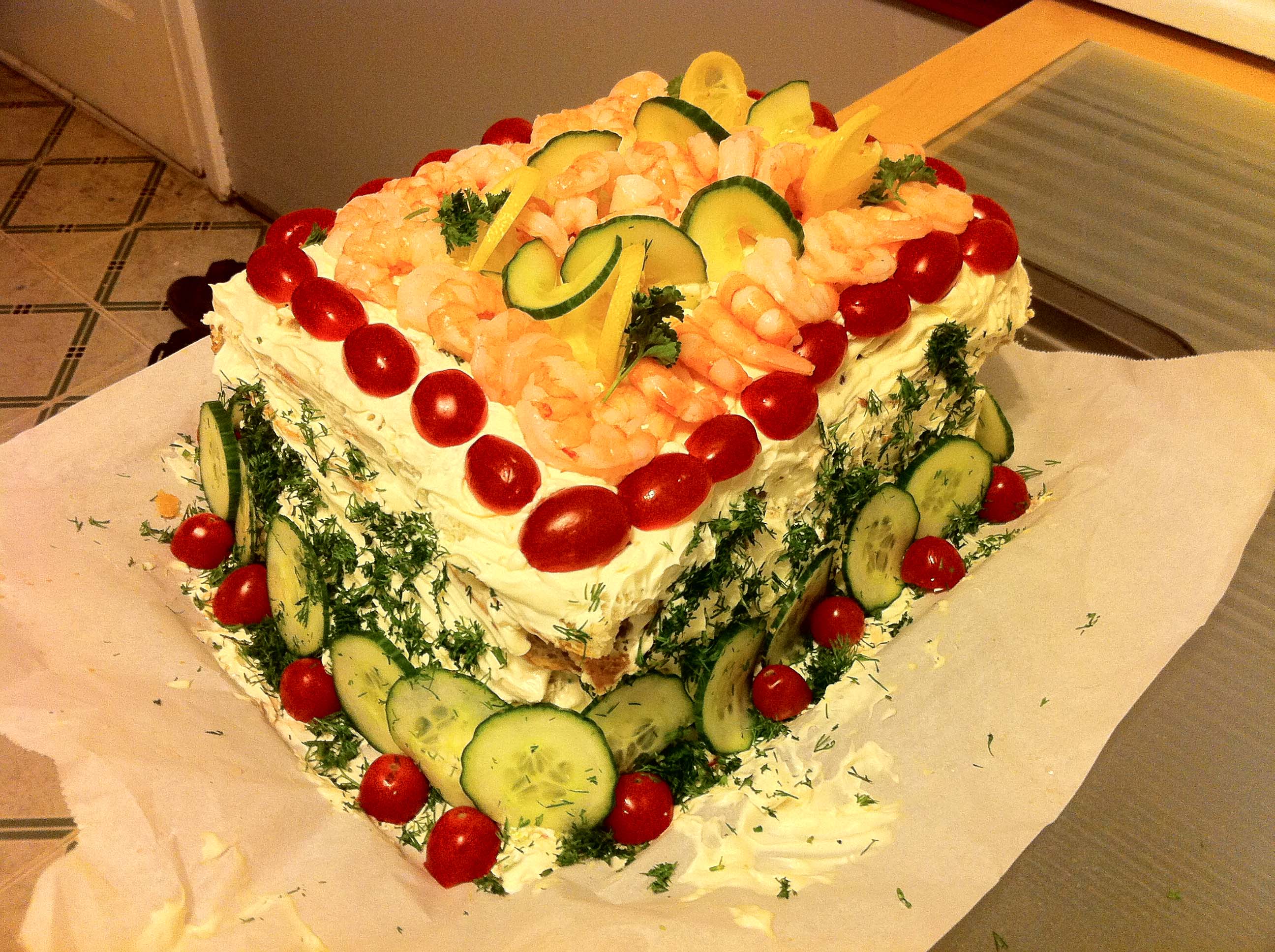 I have a long time IRC friend, named ‘Chuck-Norris’ who always talked about having Smörgåstårta – Swedish Cake Sandwich. Traditionally (I’m told) this is served for special occasions, such as a birthday. Looking at the pix made me drool! This is something that is not sold, nor made here locally, so I had to guess at how it was supposed to look, and taste like. This was my first, and only attempt (so far) at making one.
