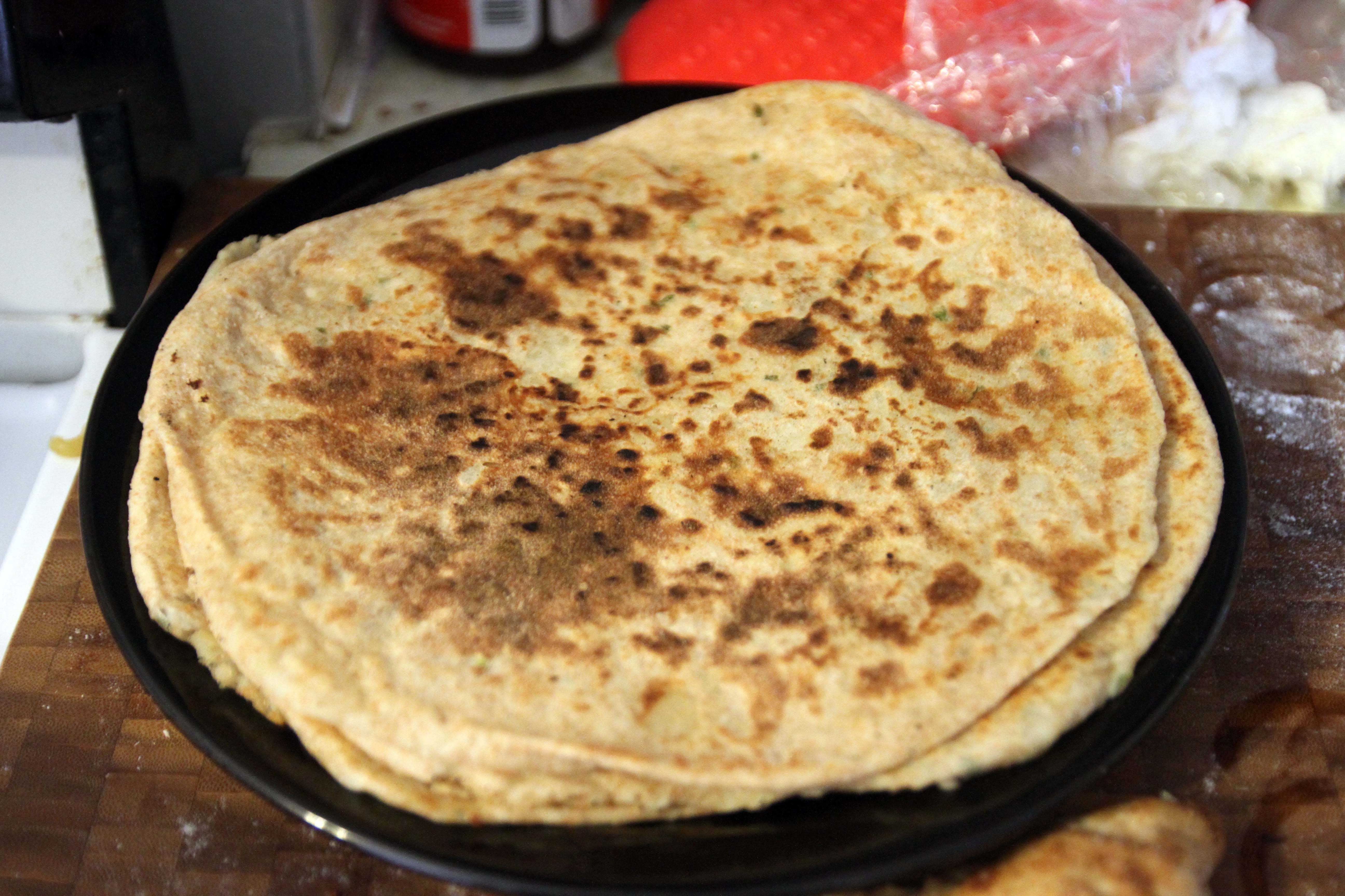 To make the dough, just add flour, baking powder, salt, and water. that’s it. Pretty simple eh! The stuffing is boiled potato, cumin (jeera), salt, black pepper, green onion/chives, and you can add in a few extras to personalize it. Paprika is okay, some garlic and onions never hurt.