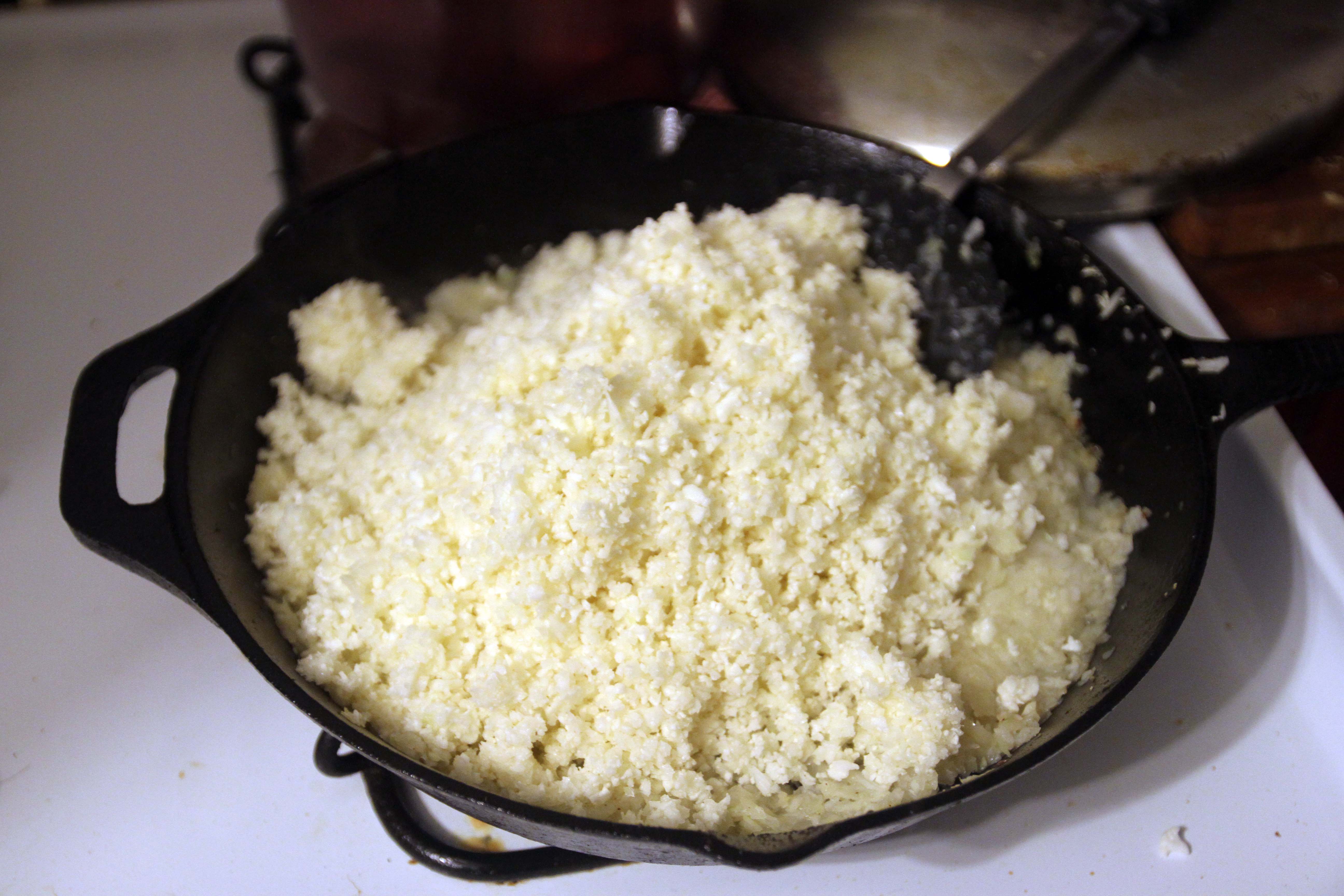 Get a head of cauliflower, remove the icky green stuff below it, and chop it up super super fine (into the size of rice grains). We also add in 1 onion per half head, and 1 entire garlic per whole head.