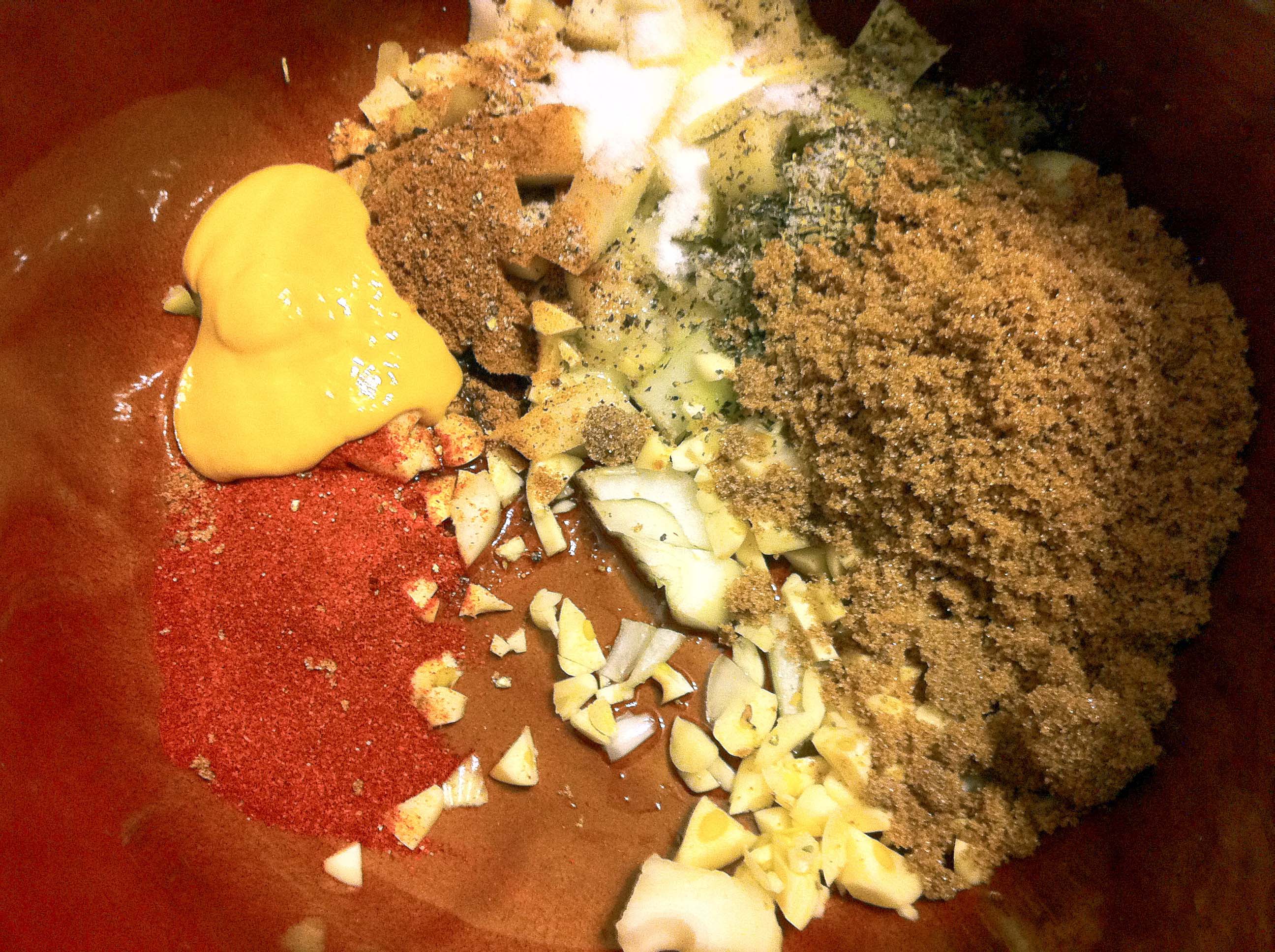 Pulled pork layer. First you need to season it, and then add it into the slow cooker. You may have already noticed a theme with my basics. Garlic, Onions, and some form of pepper. those go into *everything* I make. Brown sugar, paprika, Dijon, and some seasoning also went into this.