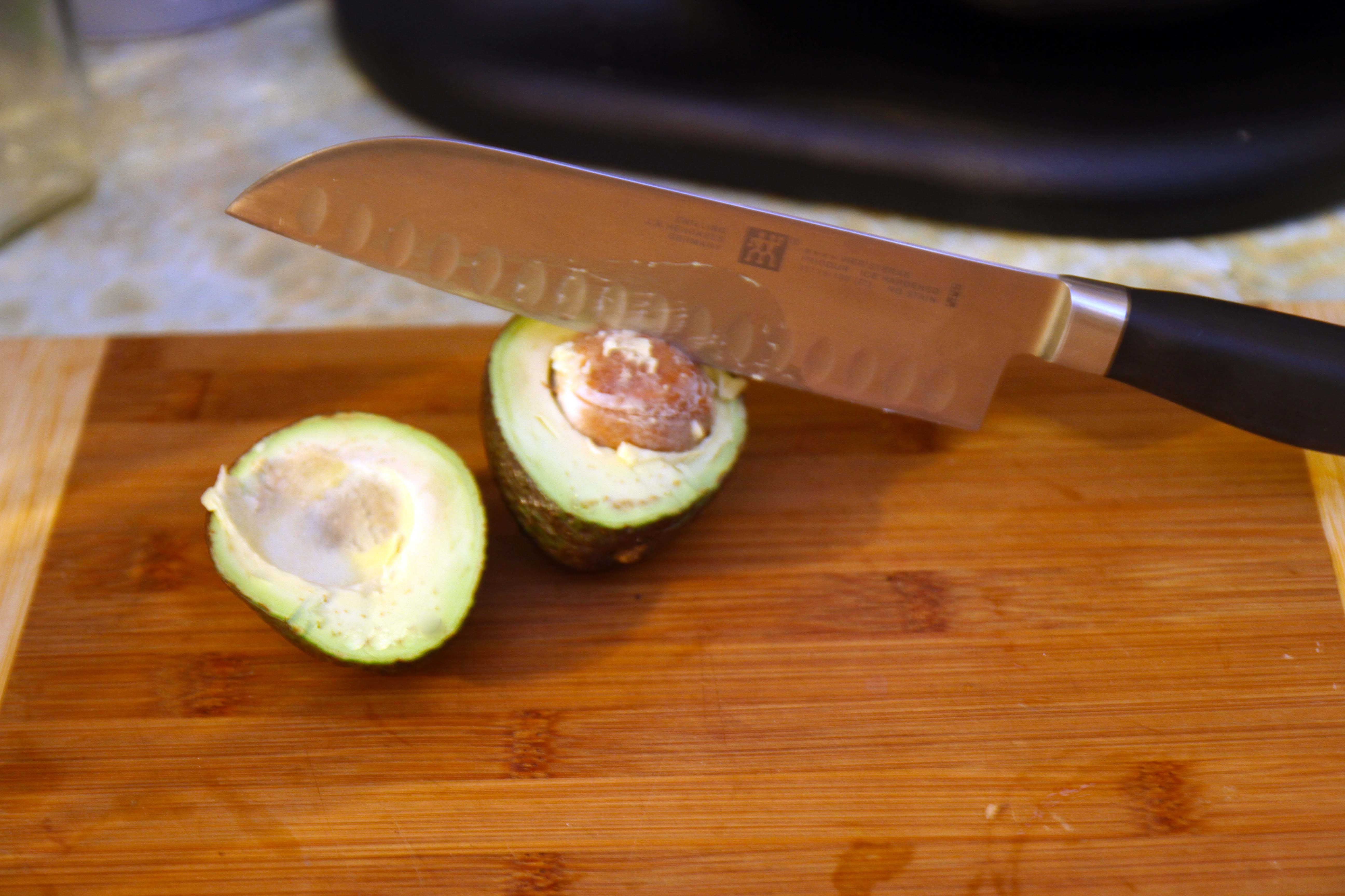 Cut your green ball of goodness in half, and remove the seed. I find the easiest way to do this is to hack it with your knife, then give it a little twist.