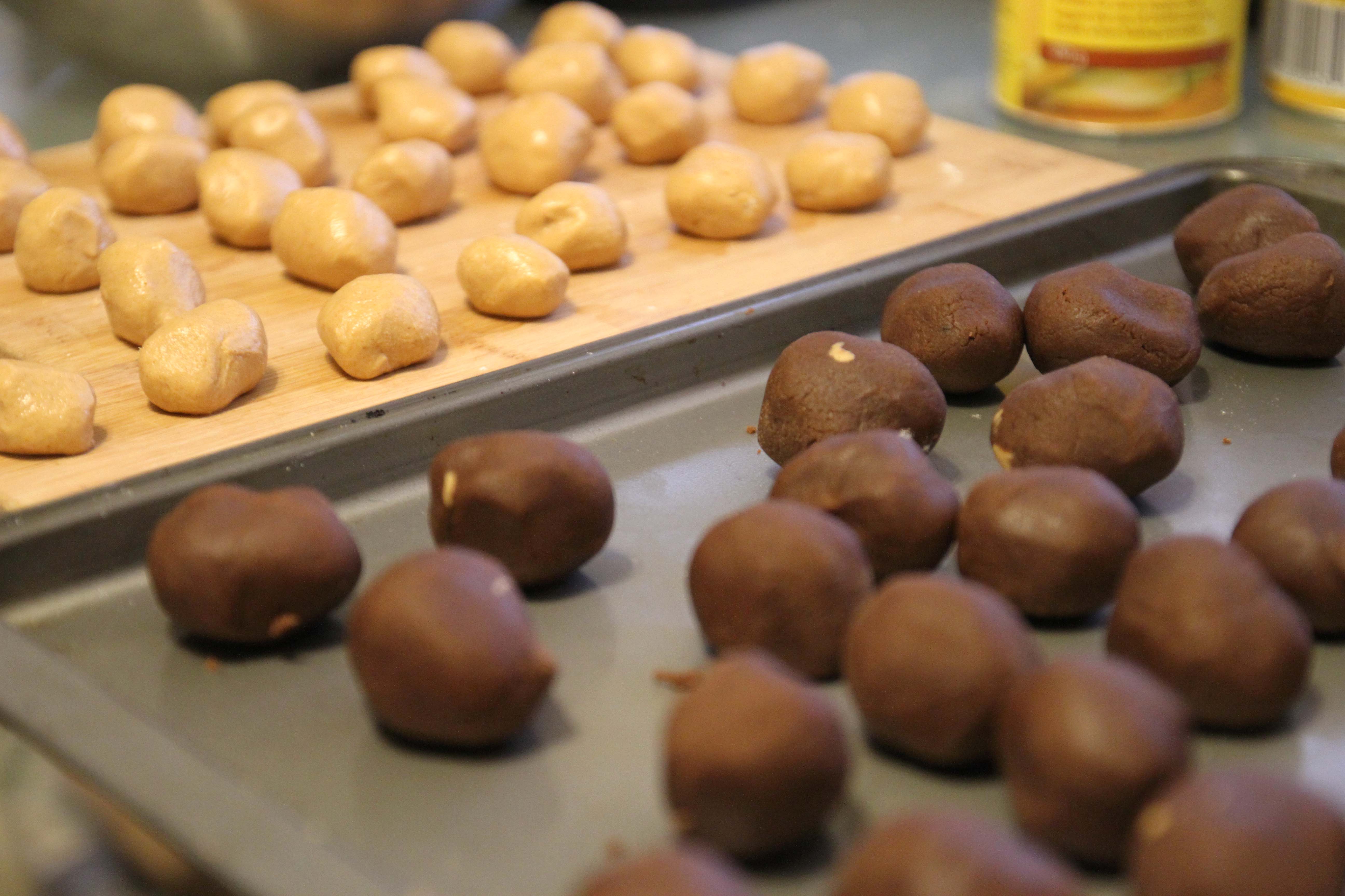 Now the fun part. take one of the dark chocolate flour balls, flatten it, place it in the palm of your hand to cup it, add of the peanut butter balls in the middle, and wrap it up so that no peanut butter is showing. Imagine you are making a wonton. Same idea. (This is the same method of making Trini Roti!)