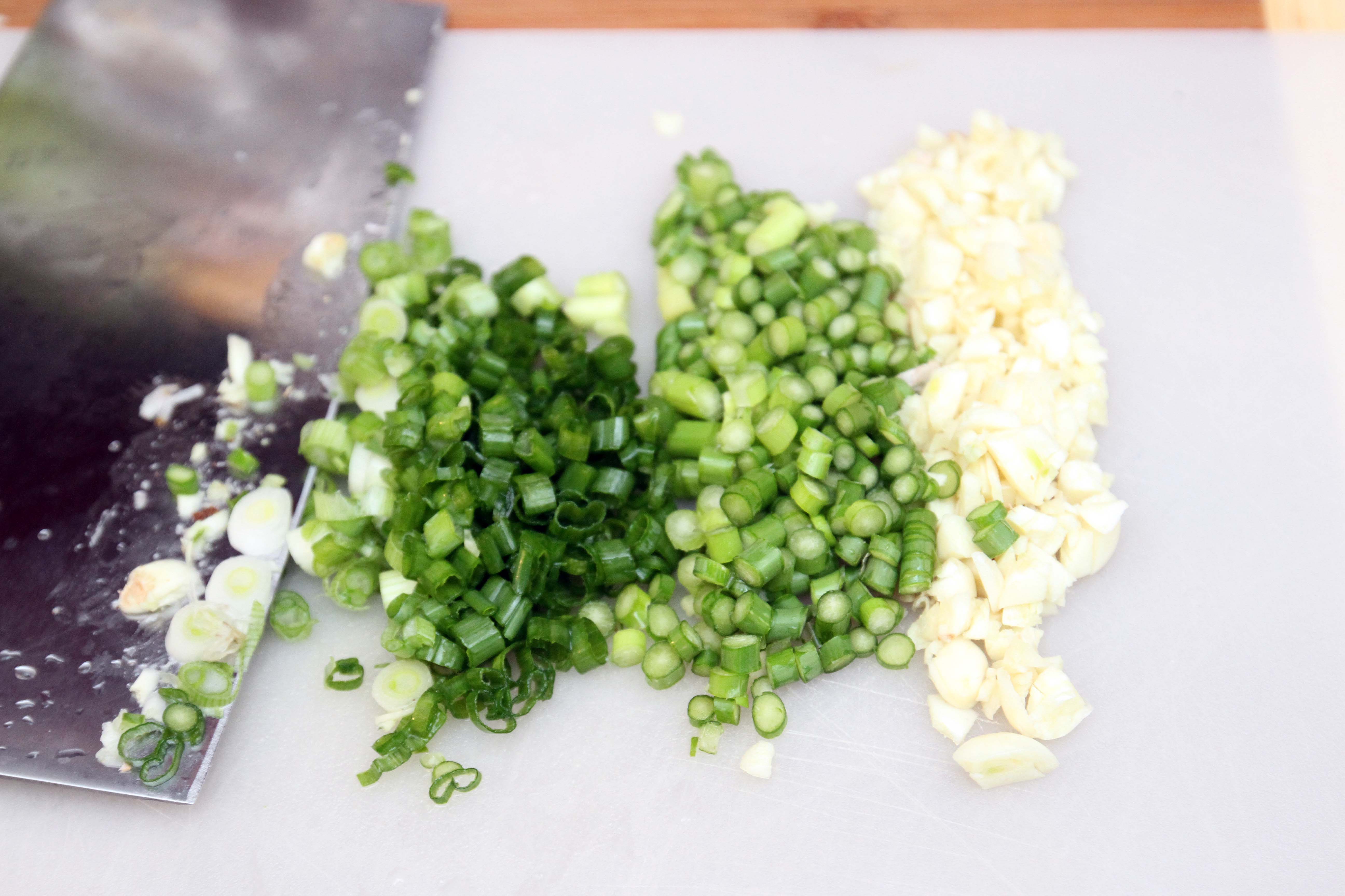 Dice the green onion and garlic stems. Mince the garlic and ginger.