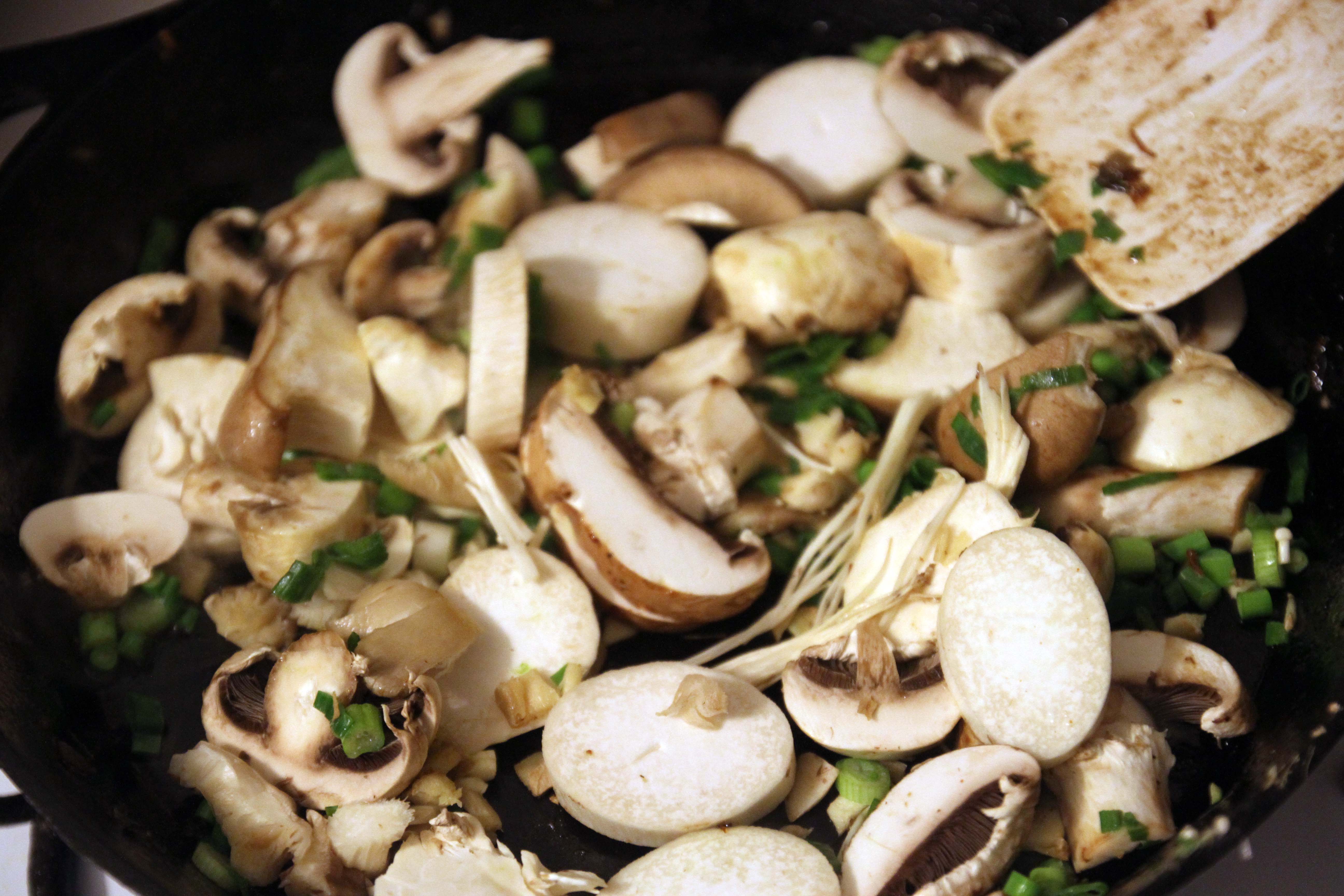 Many people I know are trying to eat healthier, and/or are vegetarians. I decided to try out a mushroom based filling to see how it would turn out. All of the ingredients are exactly the same, except substitute mushrooms for the pork. I used king Oyoter mushrooms, enoki, white button, and shitake mushrooms. Slice the mushrooms coarsely.