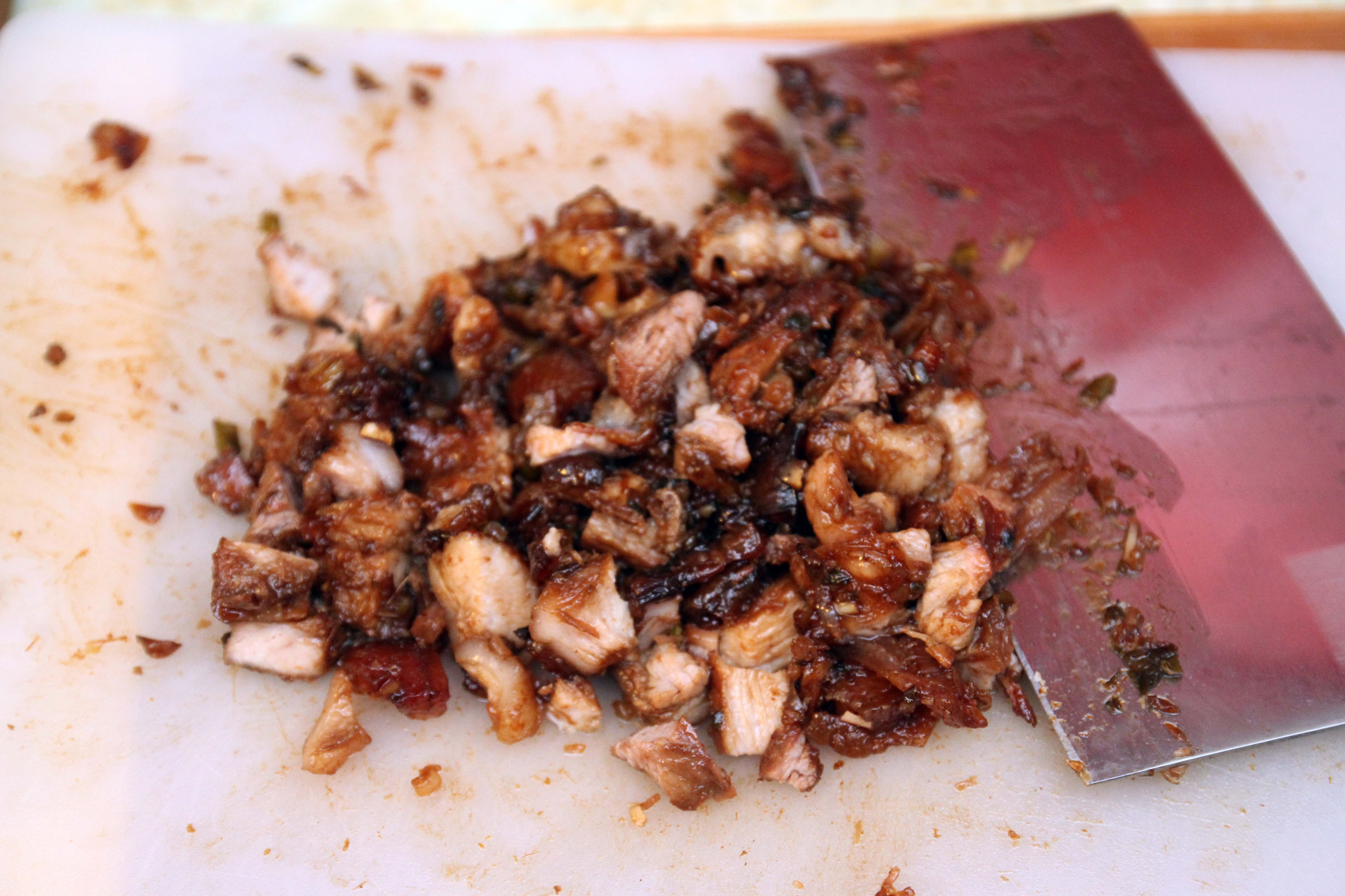 However, we are not stopping at this point. What we are going to do is make the filling for the bun. Slice up all of the pork belly, and place into your frying pan or wok. Prepare your veggies and sauces.