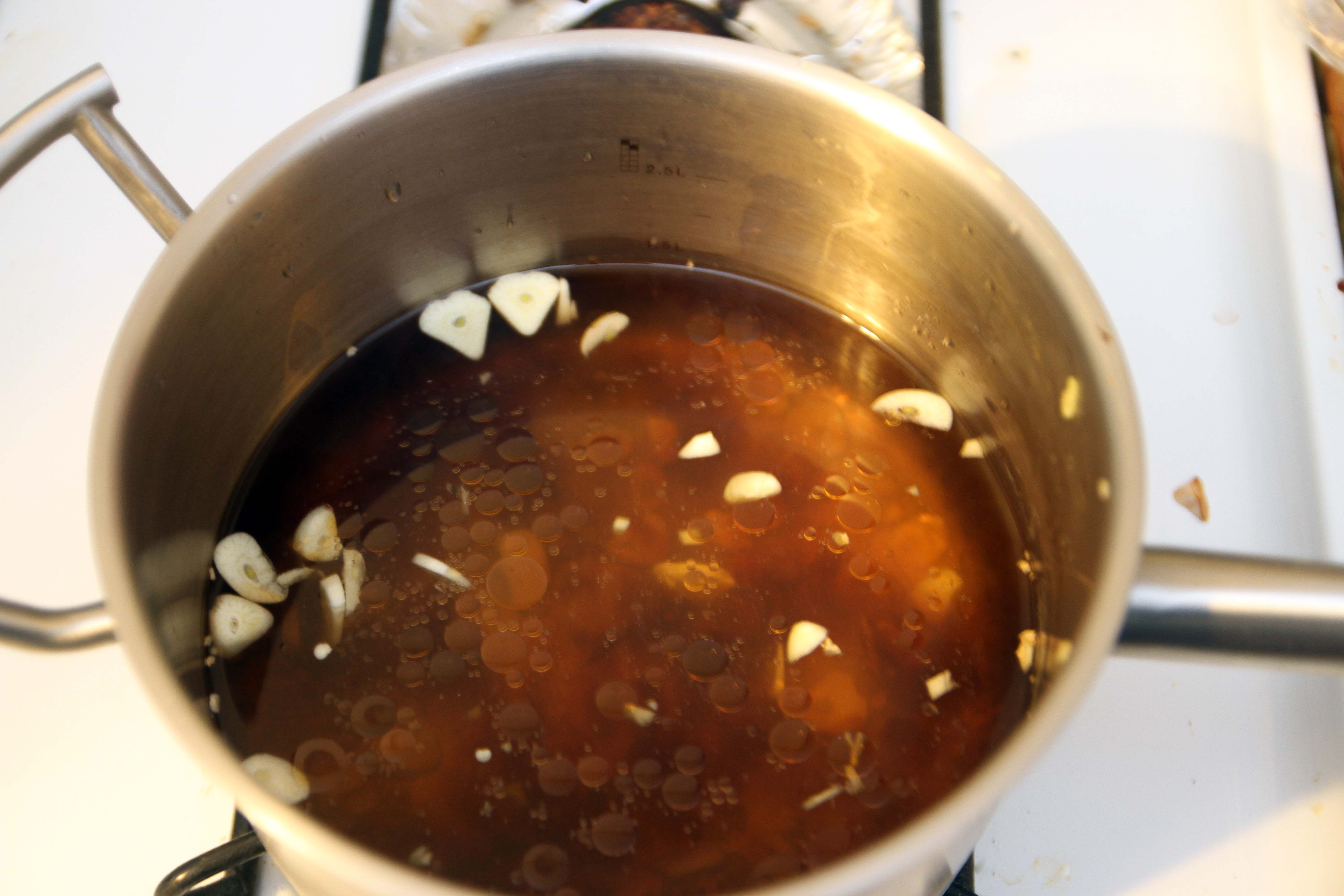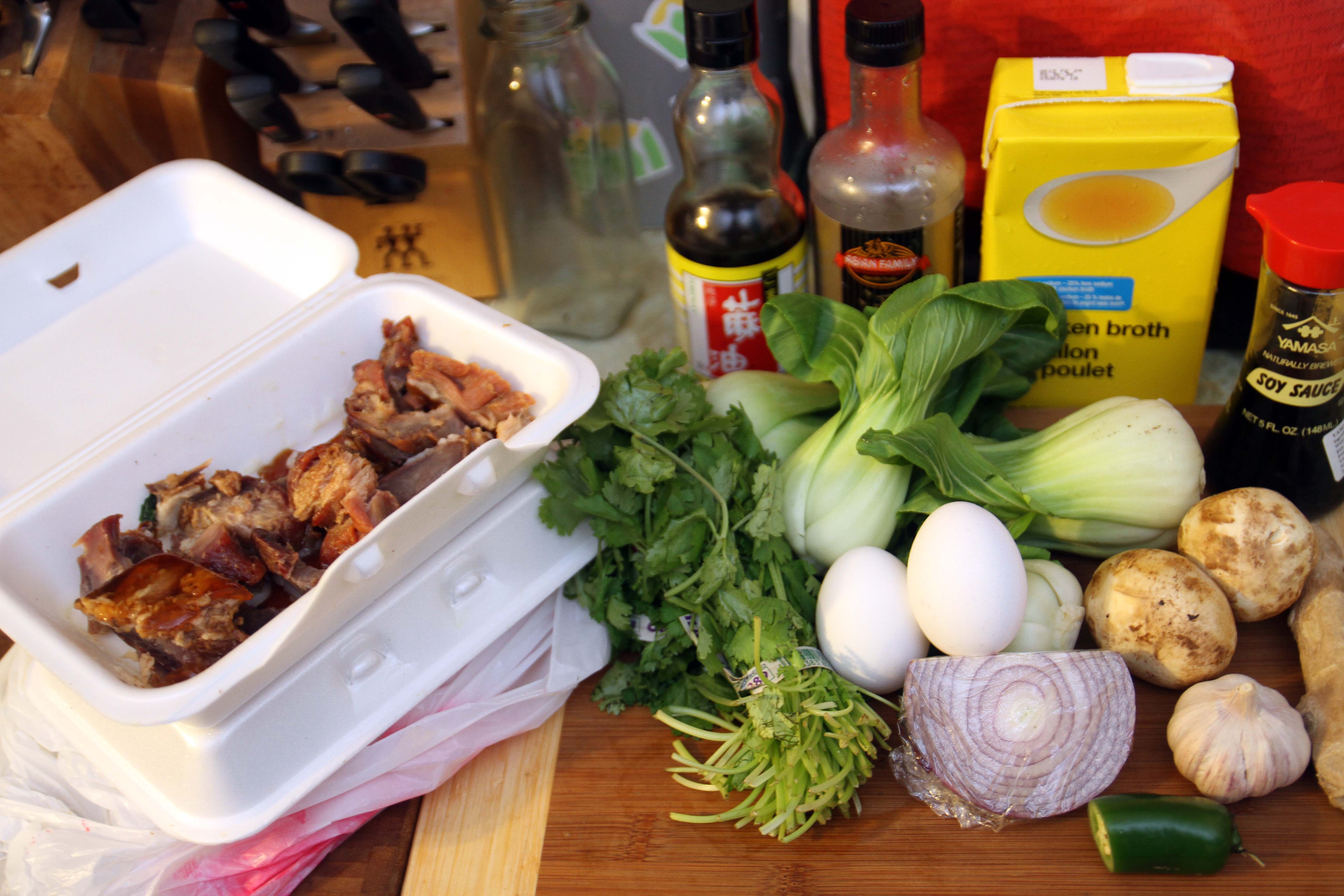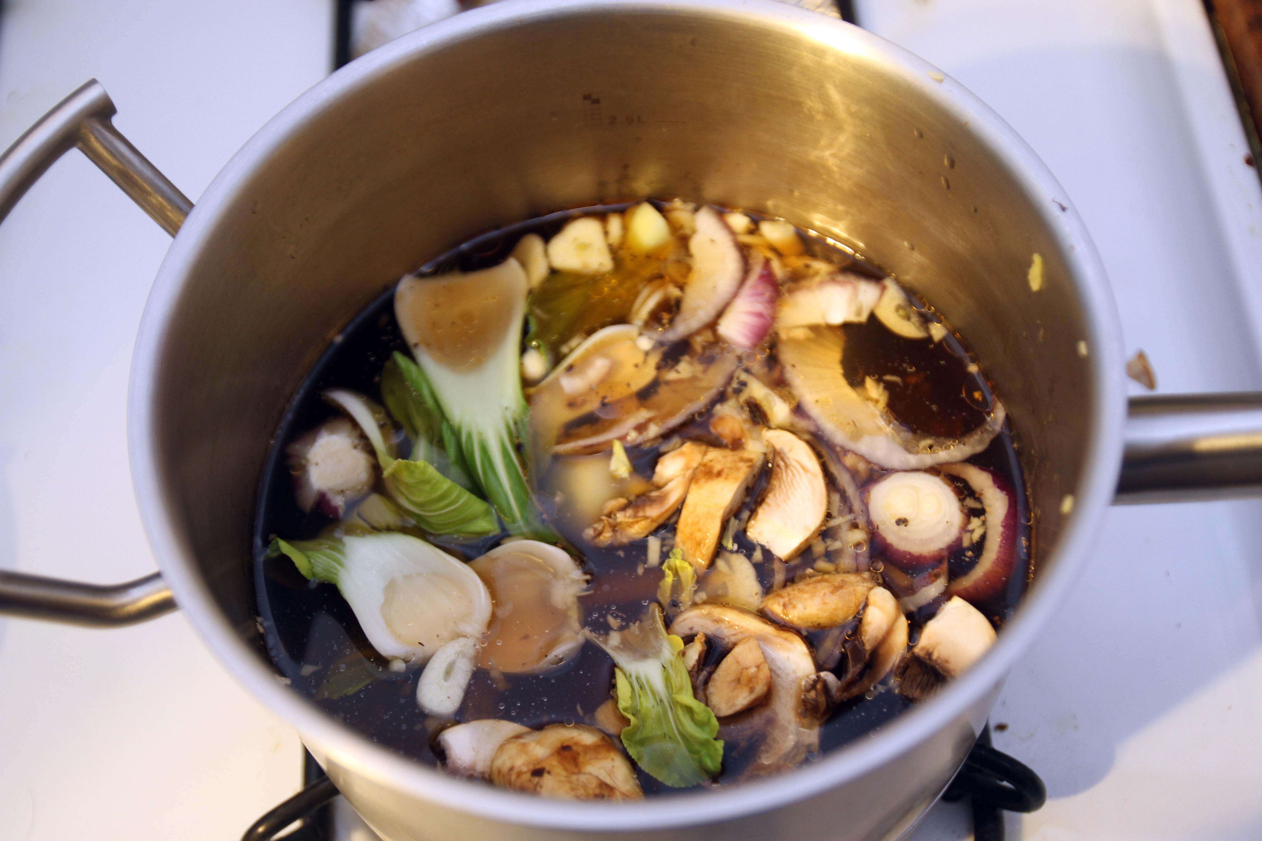 When the soup stock is done, strain out all of the solids, so that you are left with a deep amber coloured liquid, with nothing else. Pour into a bowl, and add in freshly sliced mushrooms, a few pieces of bok choy, the boiled egg, and your meat.