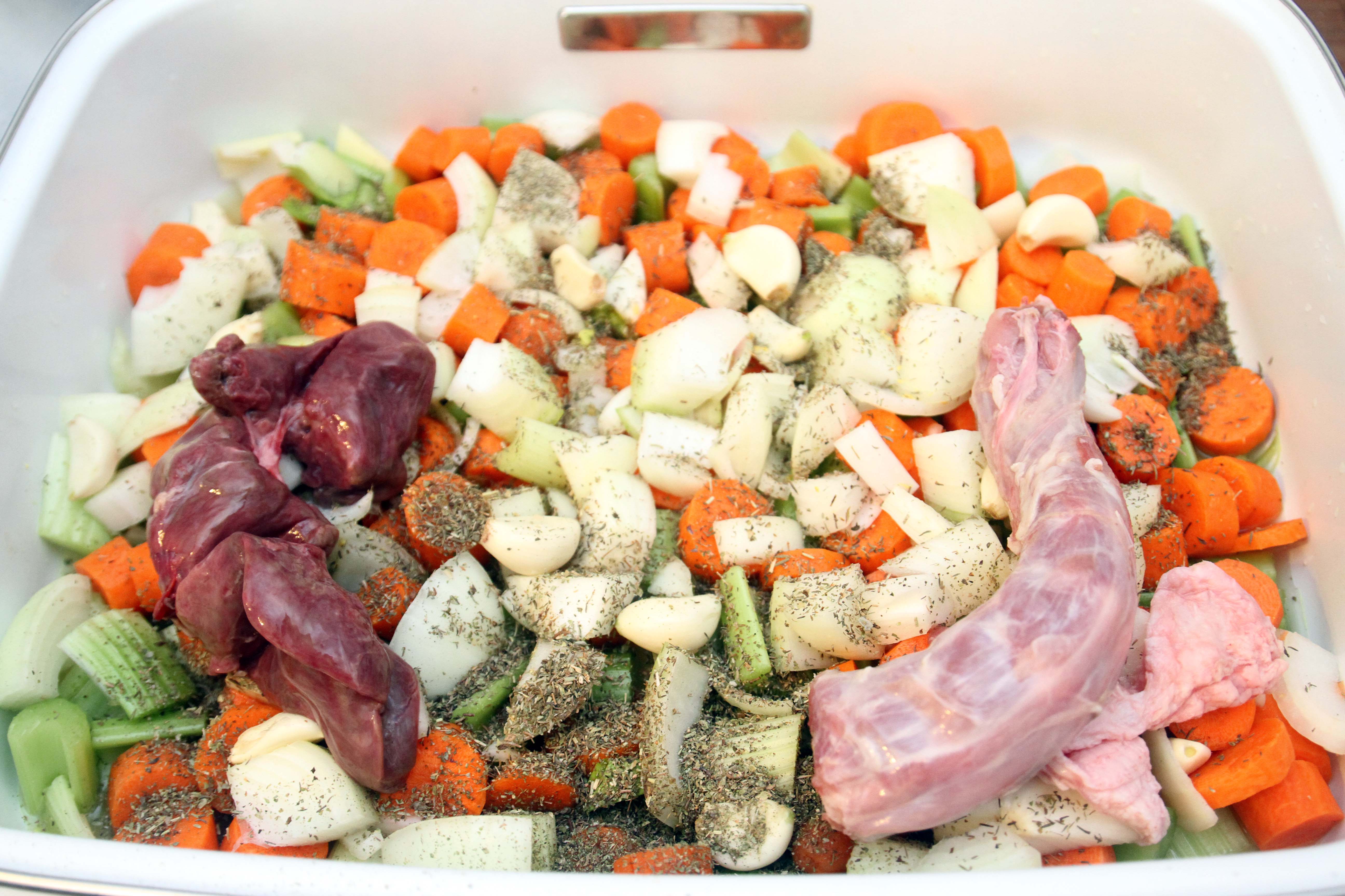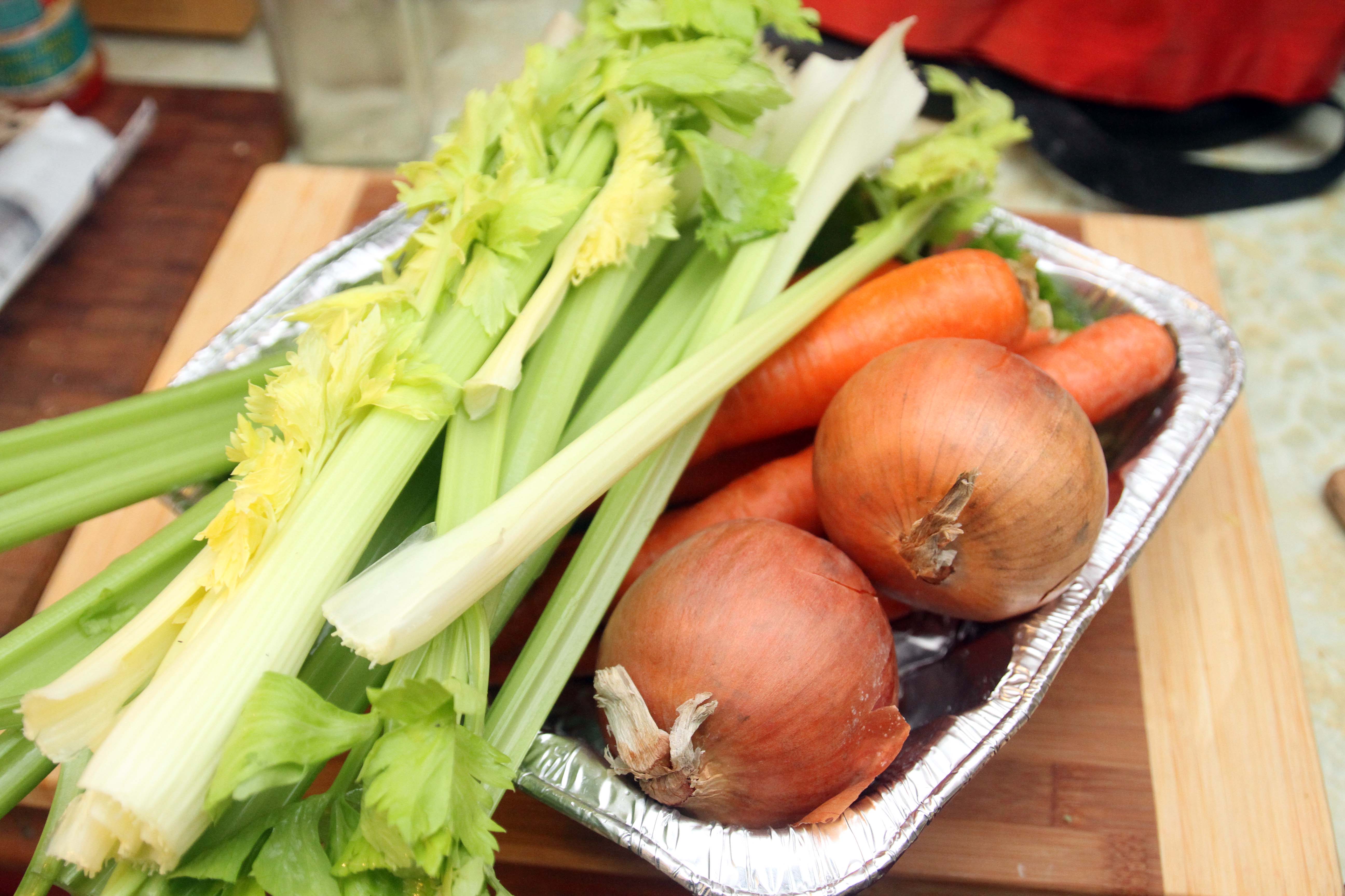 Chop up the celery, carrots, and onions into coarse large chunks. Peel the skin off of the garlic, and throw them in whole.