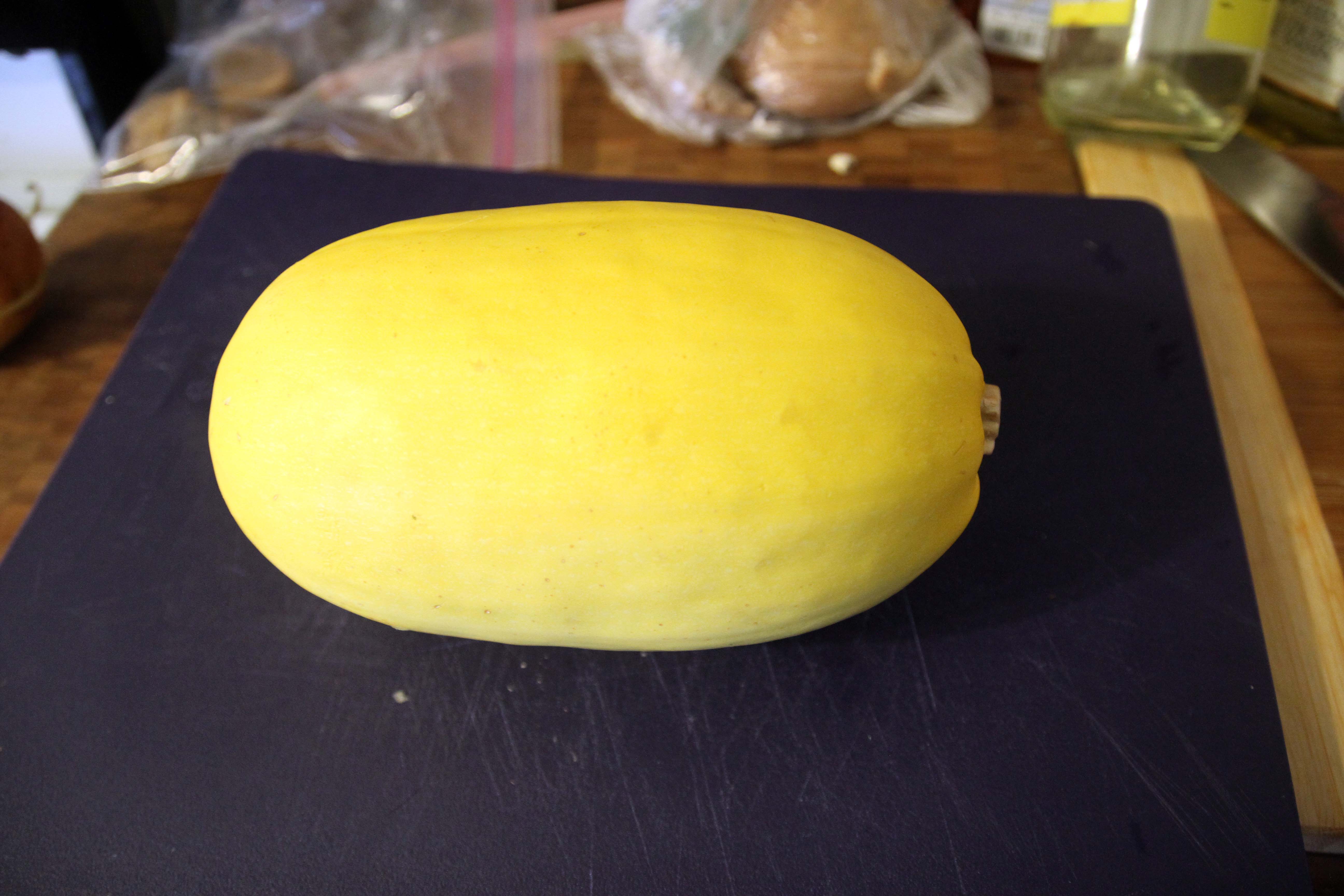 So as most of you know by now, CS has a white flour allergy which has led to some interesting food substitutions. The most significant one I’ve been on a search for is pasta, which I loooove. We’ve tried quinoa spaghetti, brown rice lasagna, 100% whole wheat linguine and, surprisingly, the list goes on. I’ve been really impressed with the variety of gluten-free options out there and most of them have tasted pretty good. Guess it helps when you smother it with meaty tomato sauce and cheese. One of the substitutes I’ve heard of and always wanted to try is spaghetti squash. What is this strange food enigma which is a squash but comes in noodley strings??? Can it really be used in place of spaghetti?? Apparently…yes, it can!