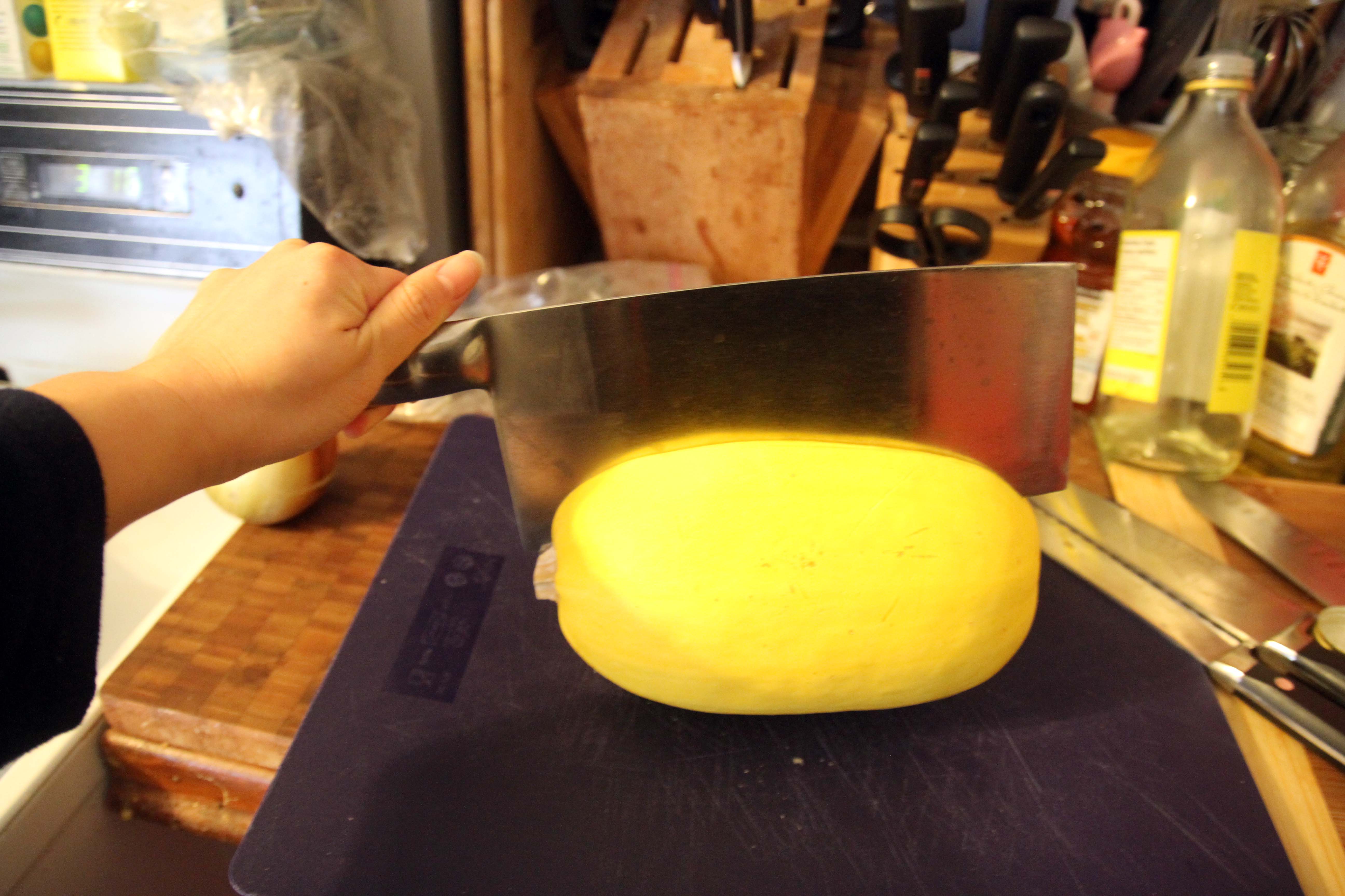 I didn’t expect it to be so hard so I tried our chef’s knife and eventually had to resort to the cleaver. I didn’t cut with my left hand but as you can see…much easier 😉