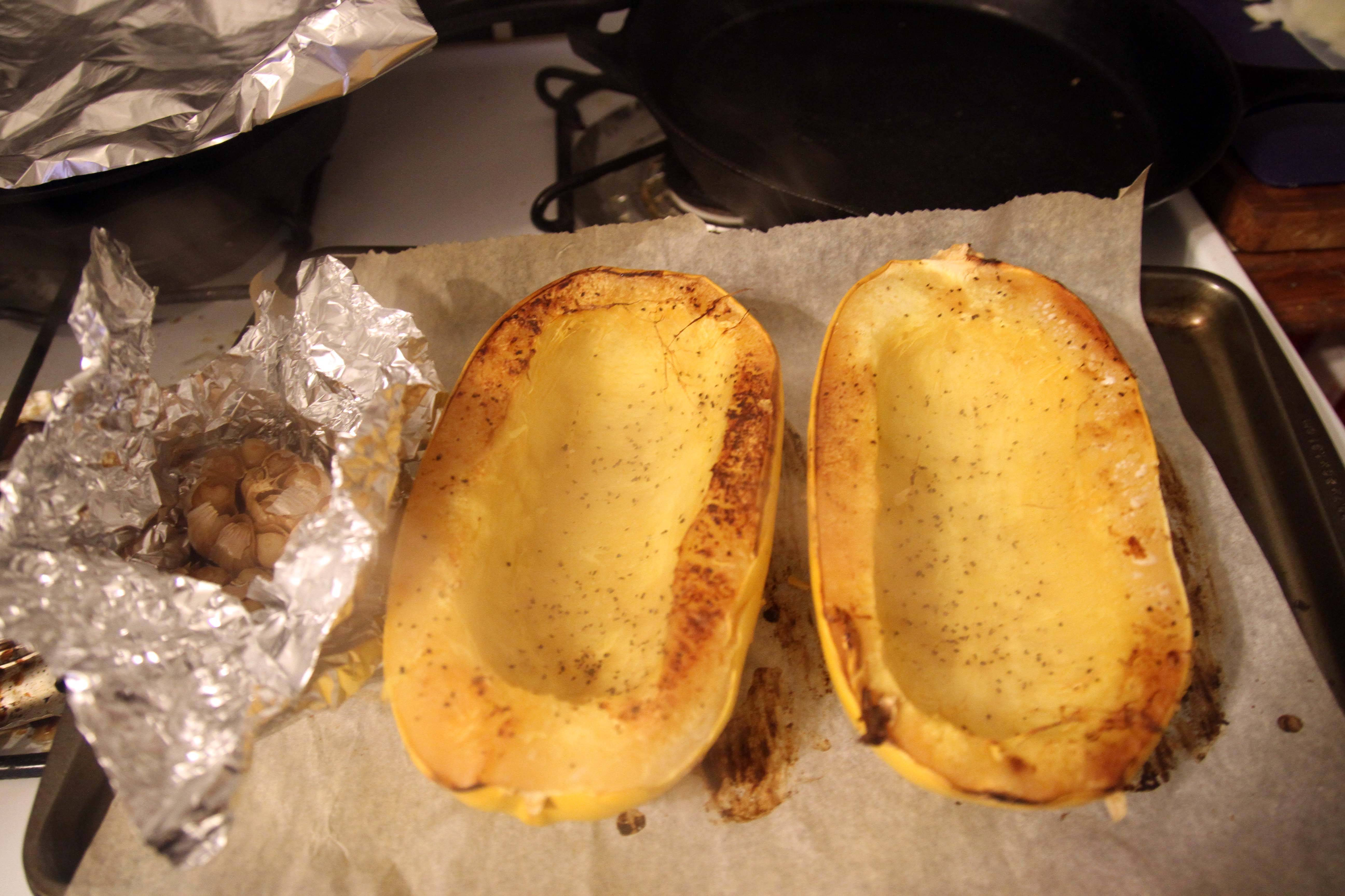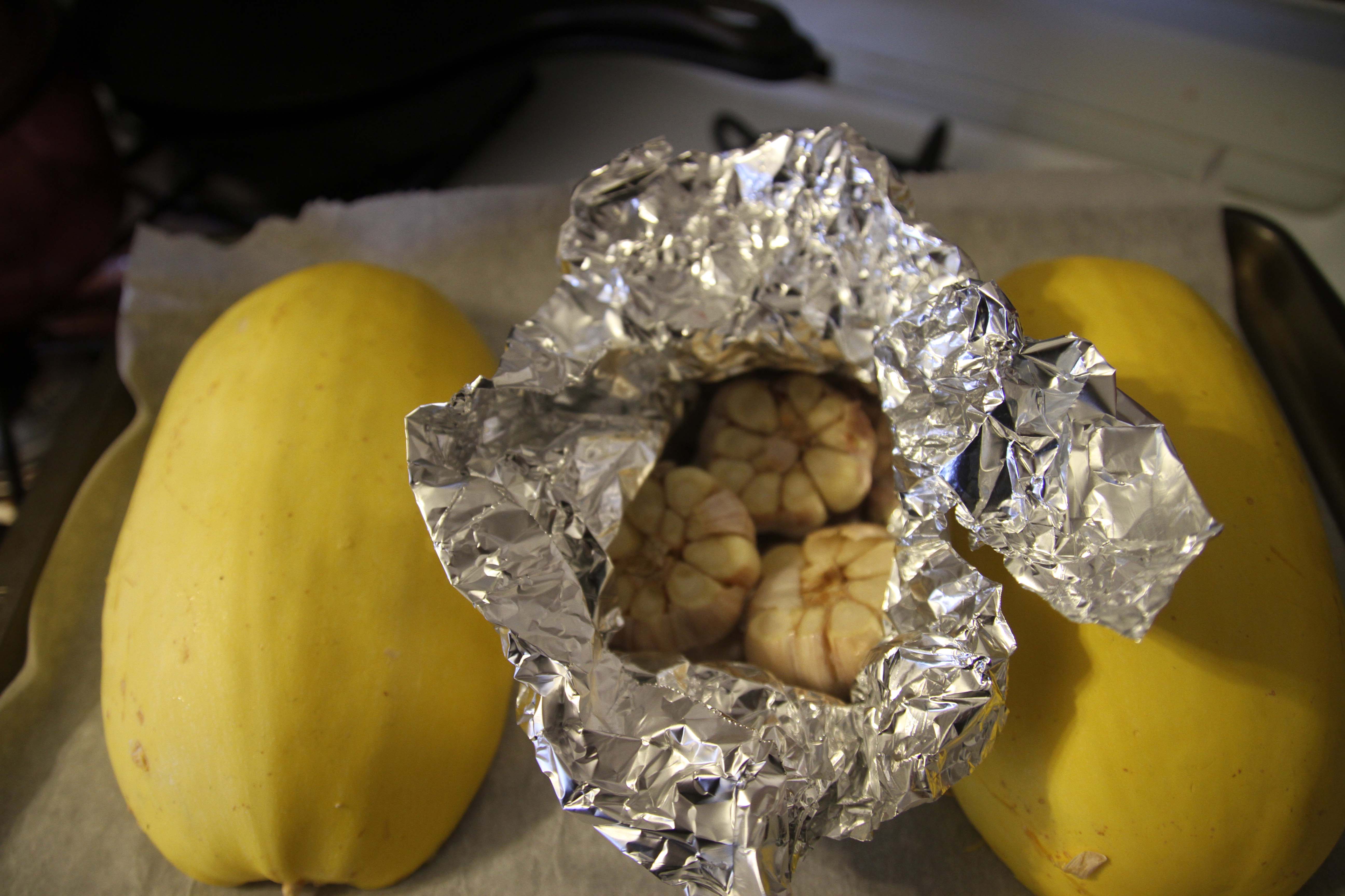Now place on a baking sheet with the insides down and hard shell up. I covered the sheet with parchment paper first for easier clean up. I also included some garlic heads that I was roasting to use up space on the sheet.