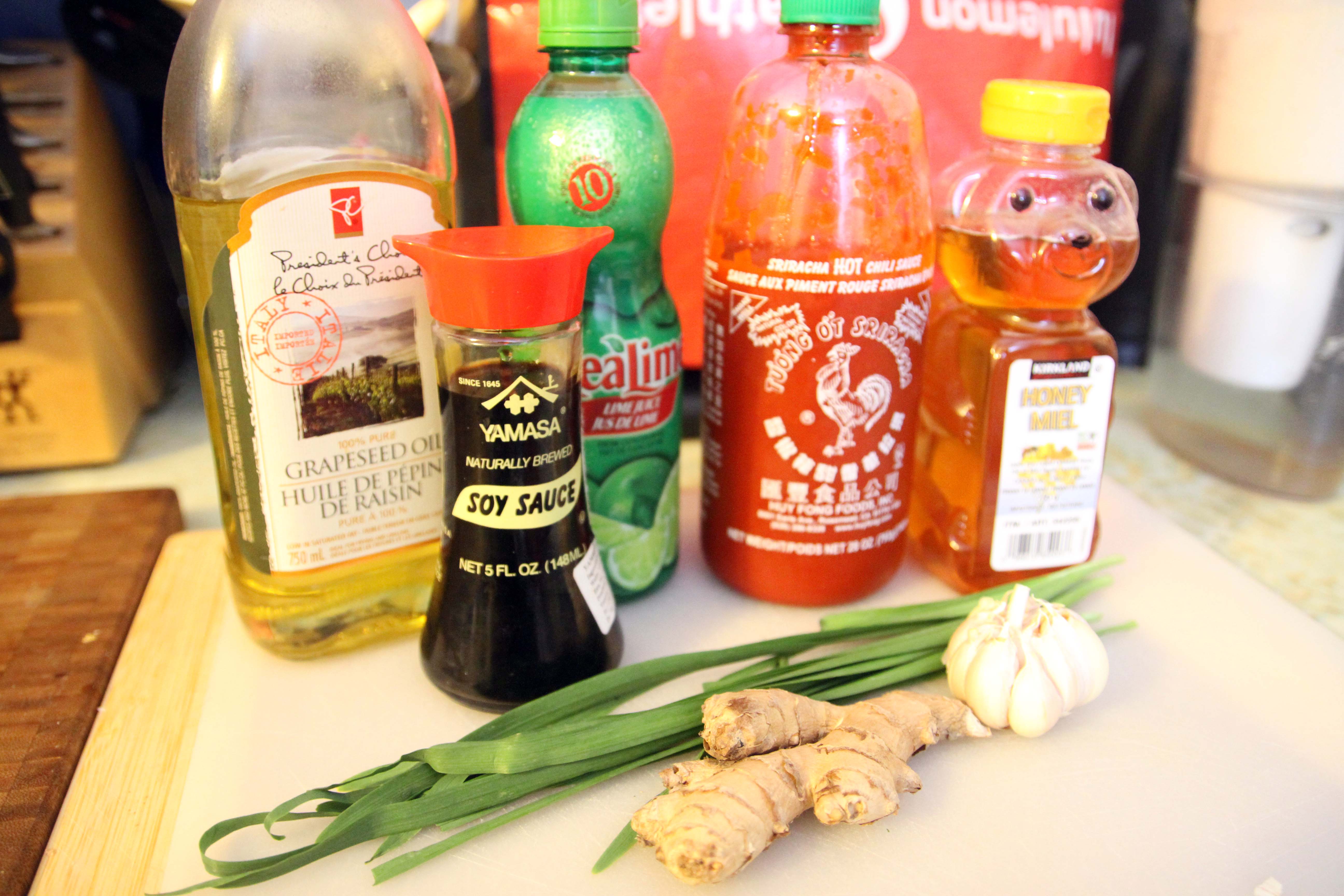 Throw everything into your blender, along with all of the liquids. Equal parts of honey, soy, and sriracha. Use 1/2 as much lime juice as the other ingredients.