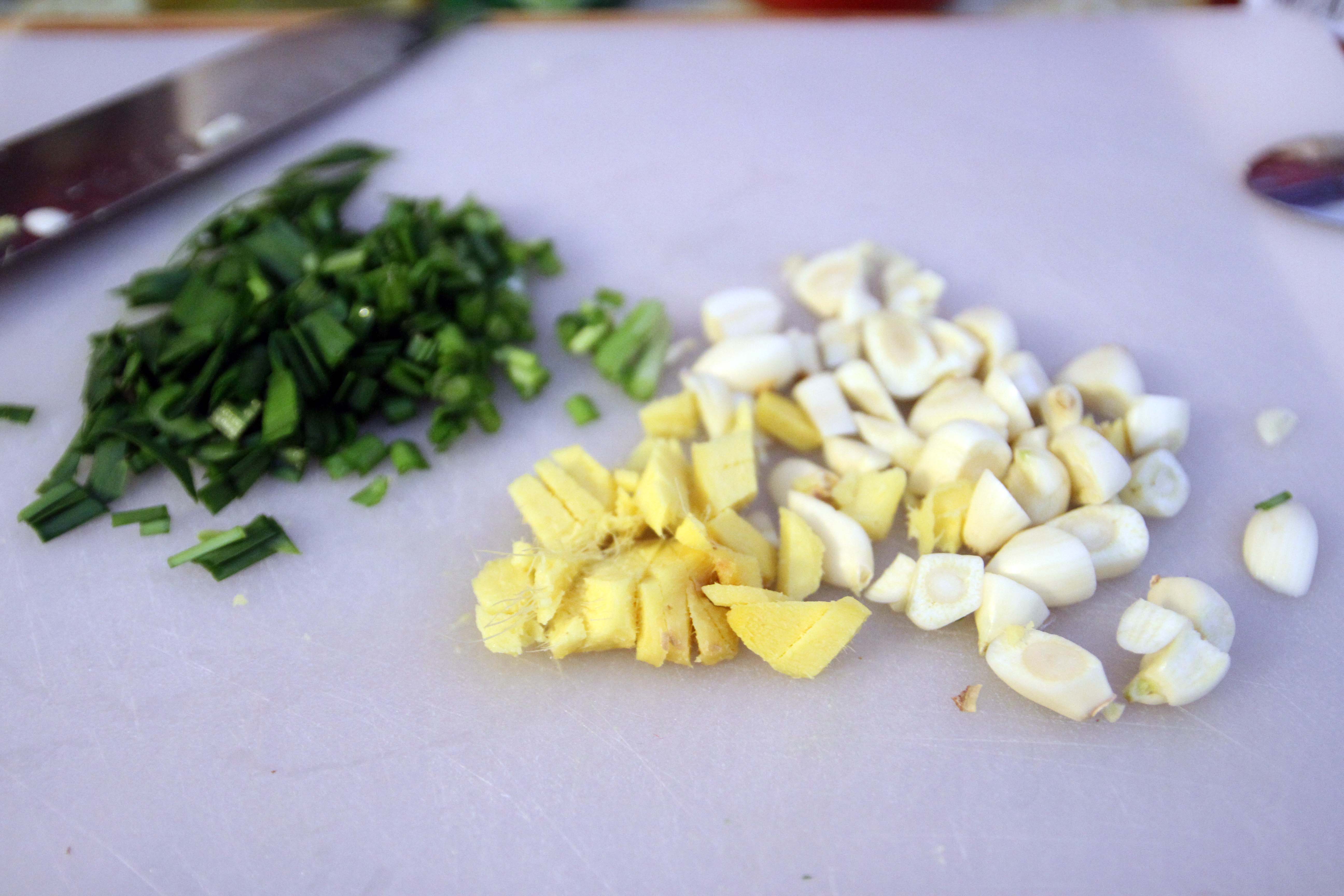 Dice your green onions or chives, smash your garlic, and do the same with the ginger. Make sure you peel the skin off the ginger first. Once again, using a spoon is the easiest way of doing this!