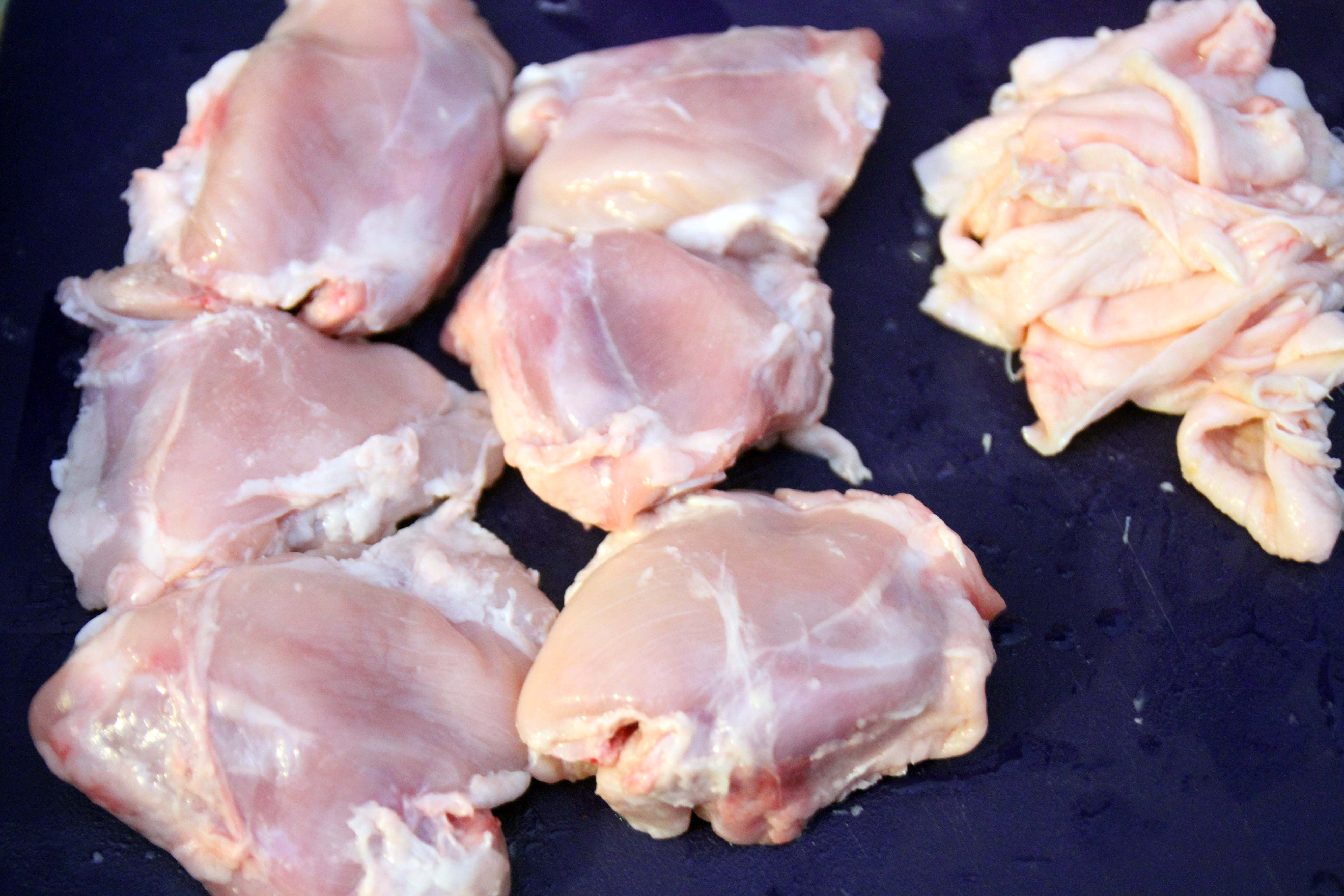 Grab your chicken thighs, and peel the skin off of them. This marinade works well on chicken wings as well! Place them all in a large dish or plastic interlocking bag.