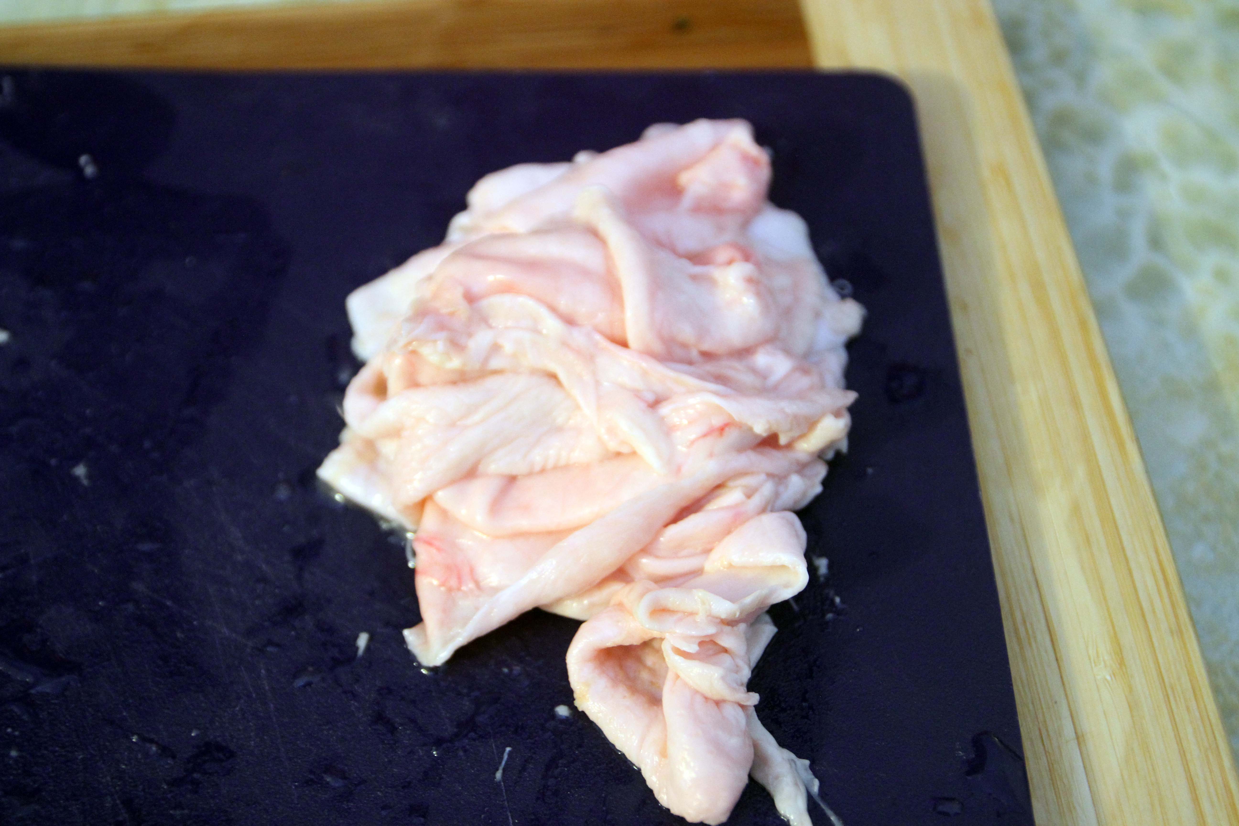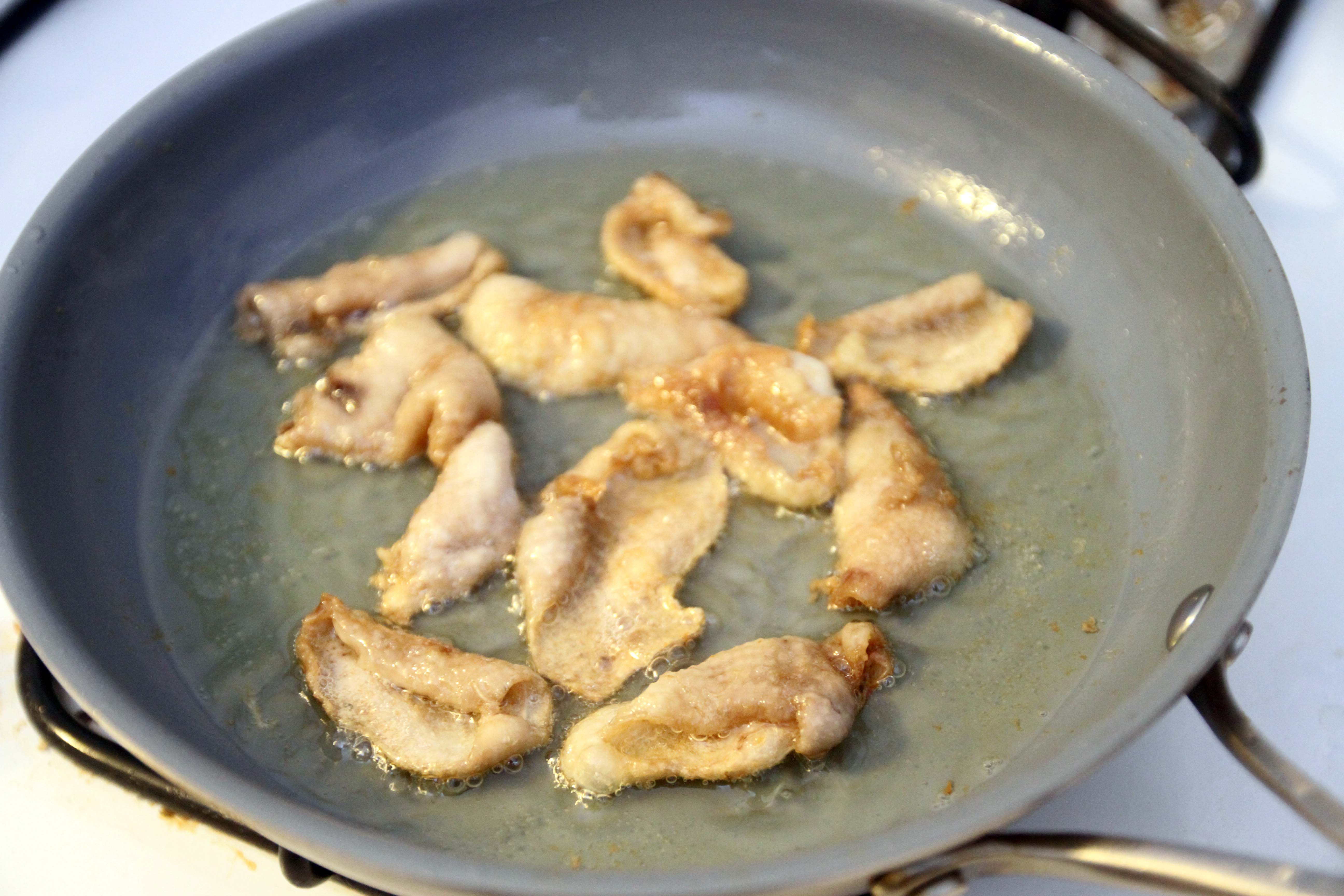 With the chicken skins that you peeled off earlier, why not fry it up to make a crispy treat?
