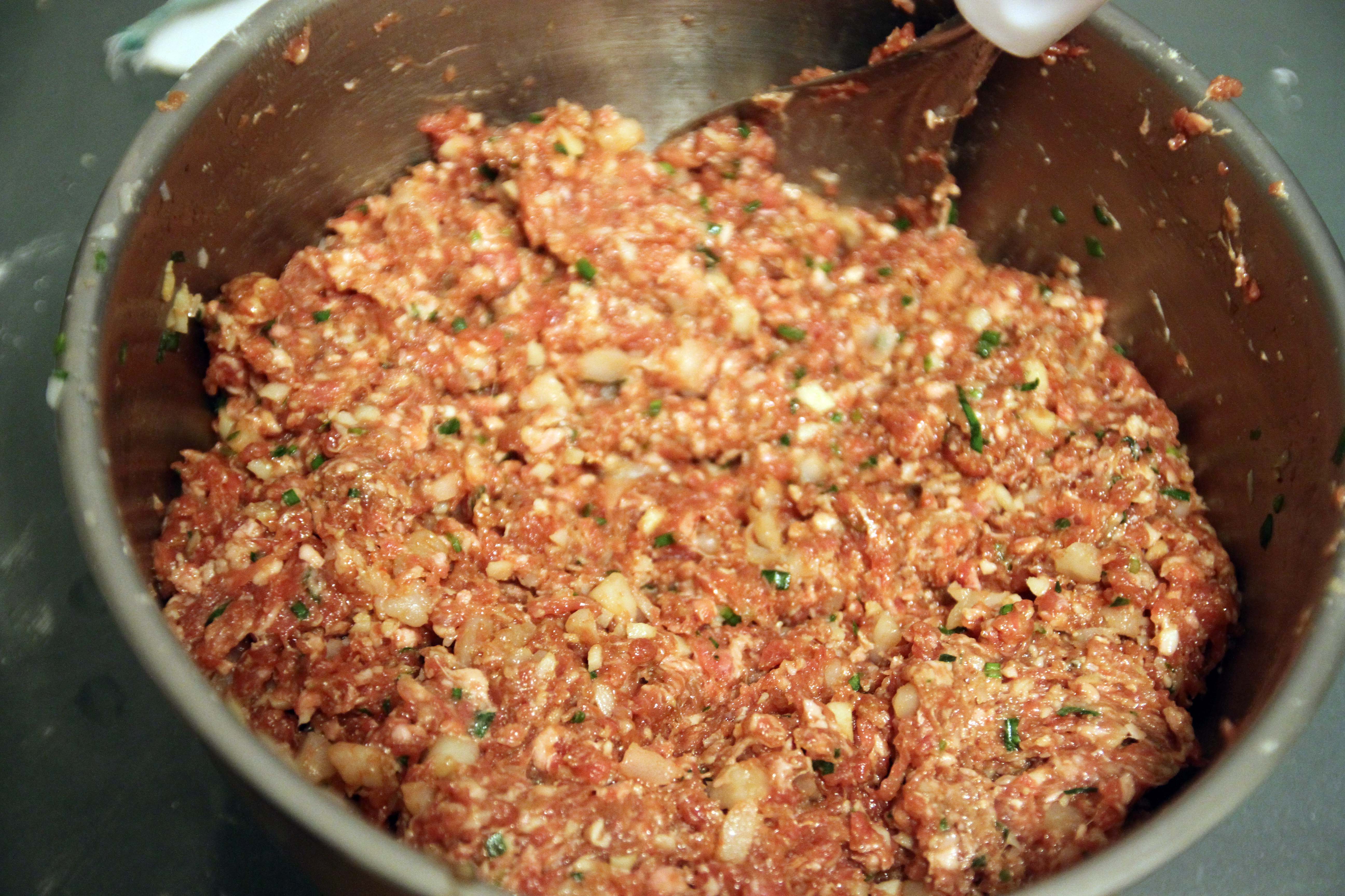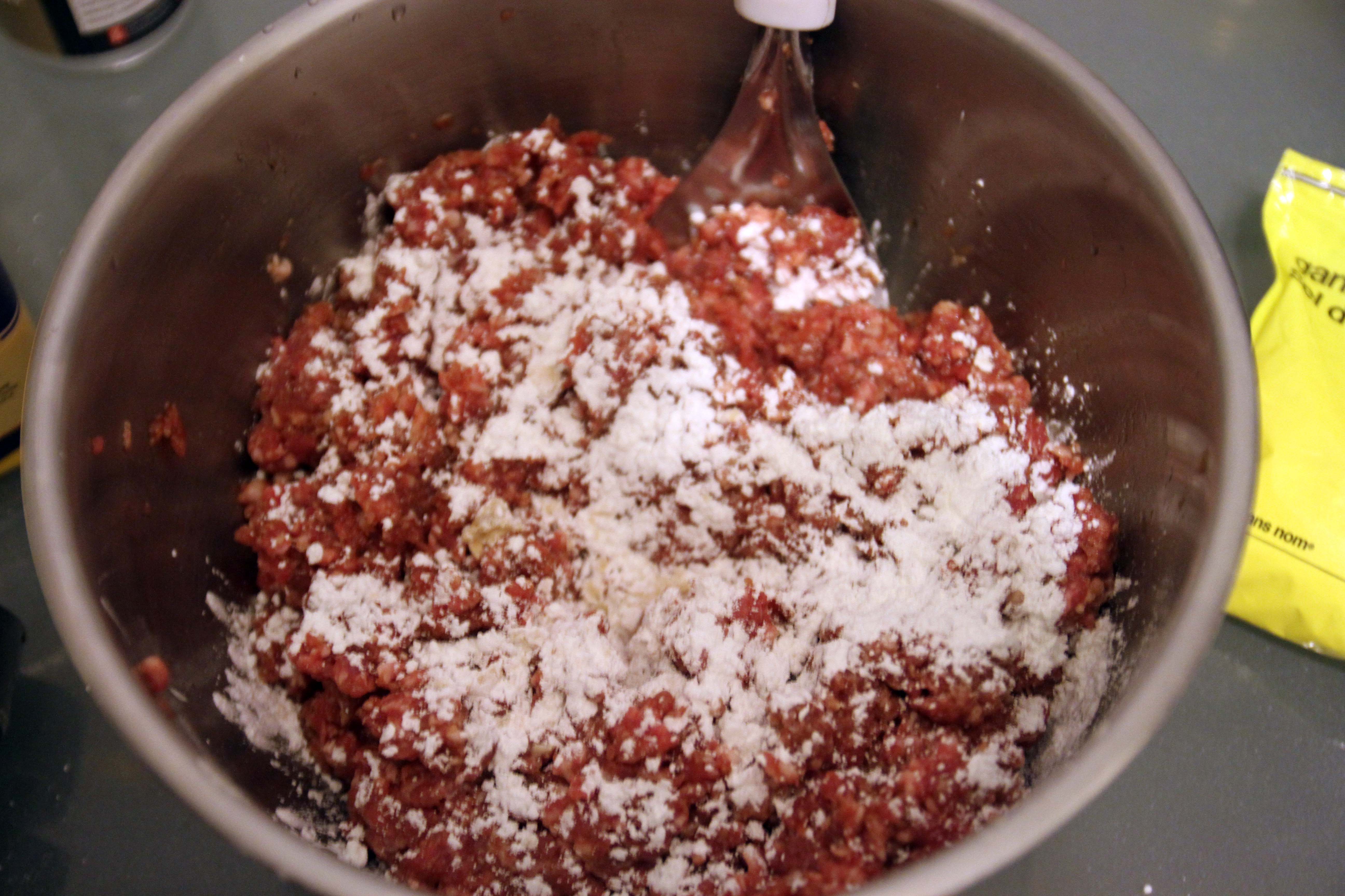 Grab your ground pork and throw it into a large bowl.  Add the garlic salt to it, and give it a stir.