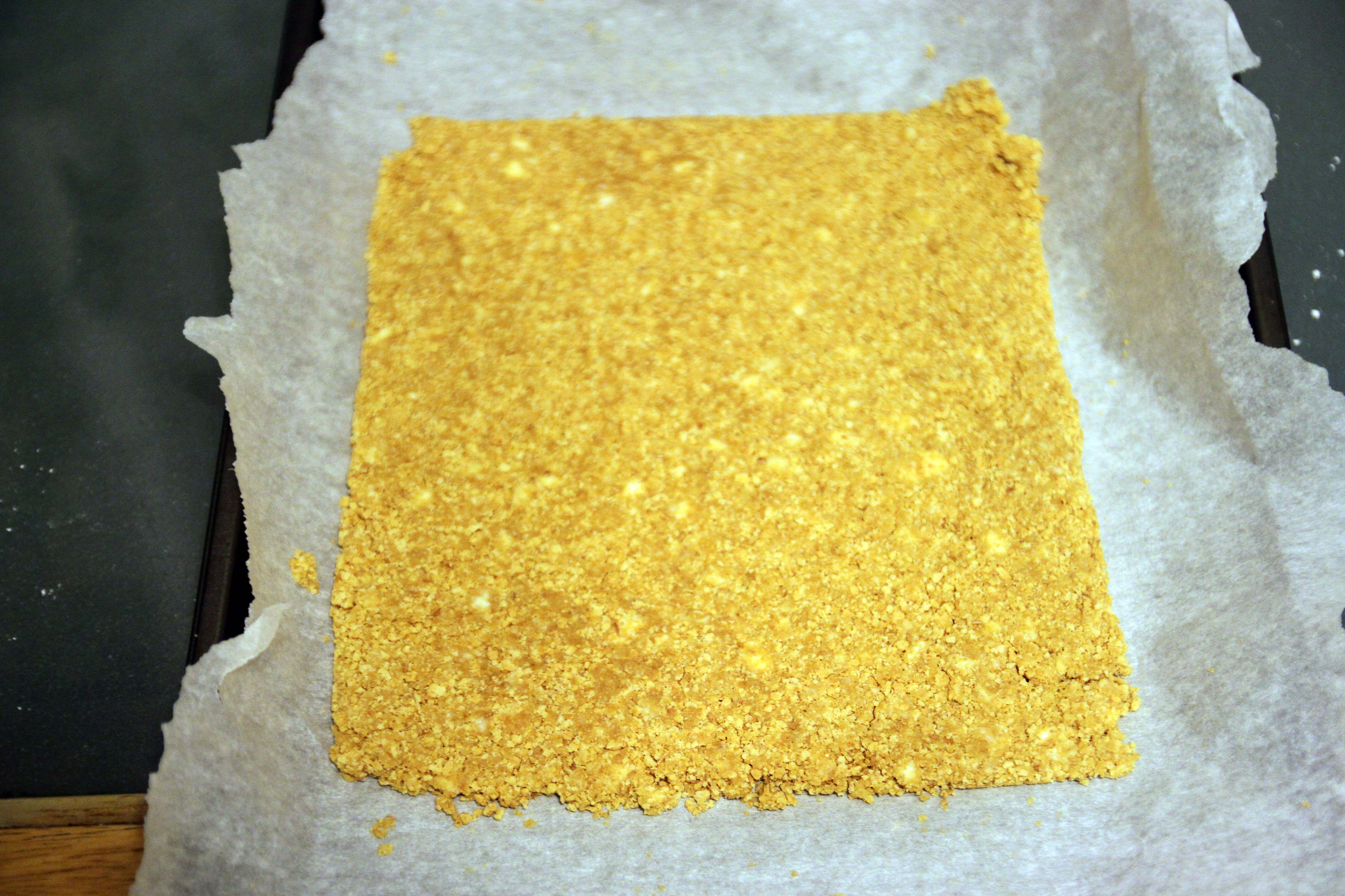 Add in the unsalted butter to bind it all together, and continue mixing. When it’s all homogenized, spread it on parchment paper and flatten it.