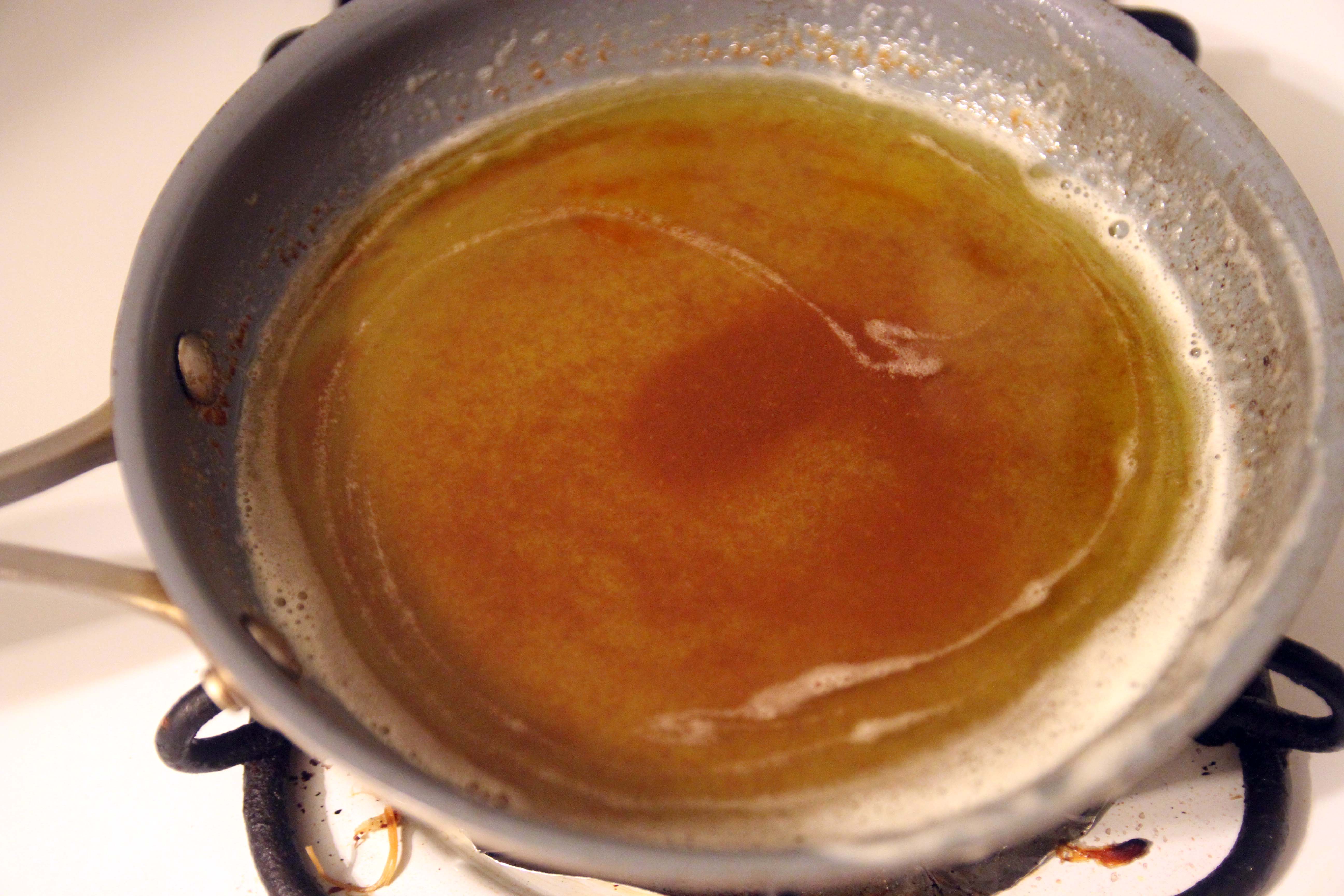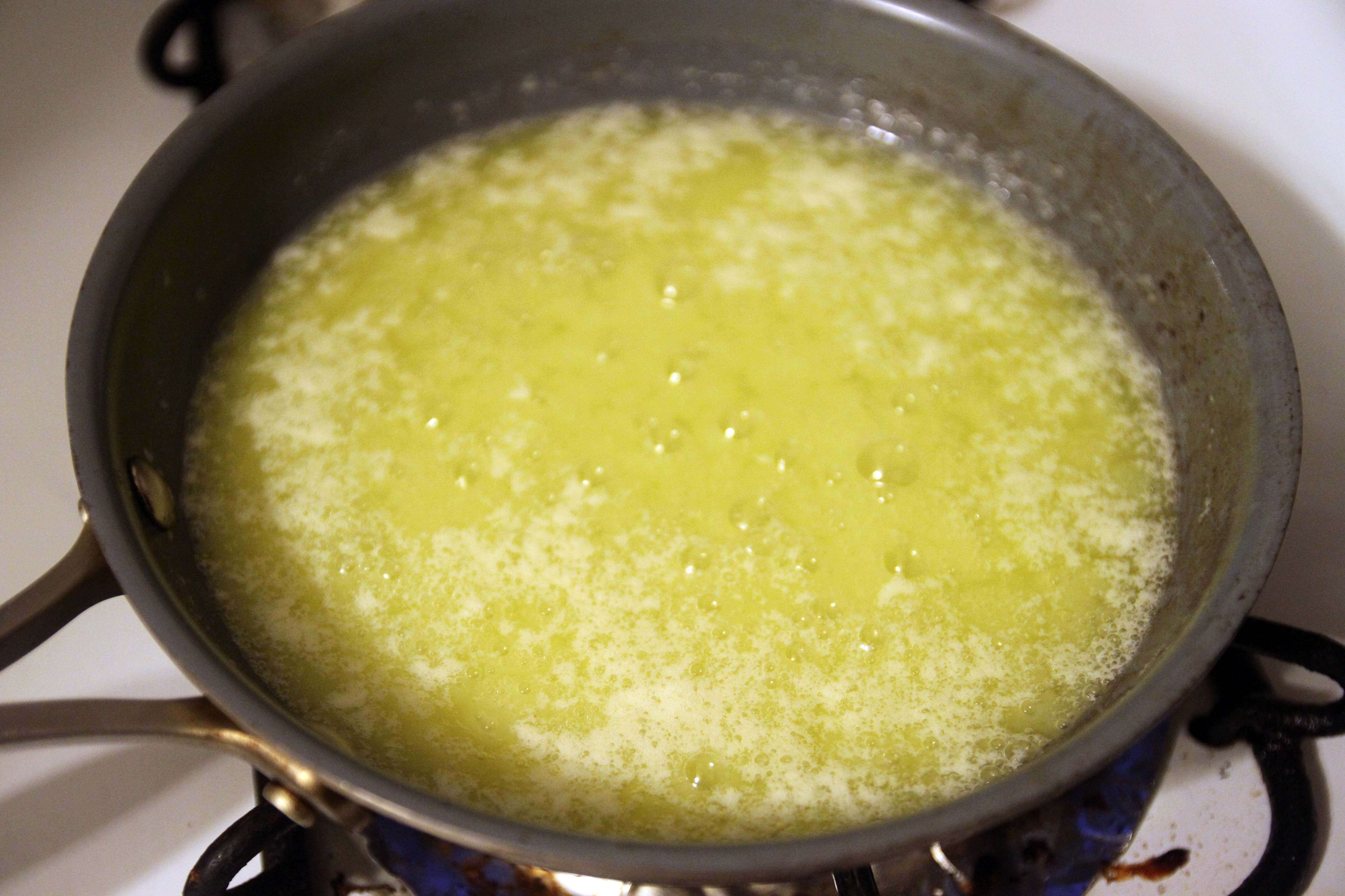 Use medium heat, because you don’t want to burn the butter. It melts quickly and if you don’t watch it, it’s easy to ruin. (Also, don’t use high heat on a ceramic pan as you can see from the picture above, it ruins that as well! Damn you Zwilling for advertising it could handle high heat! IT CAN’T)