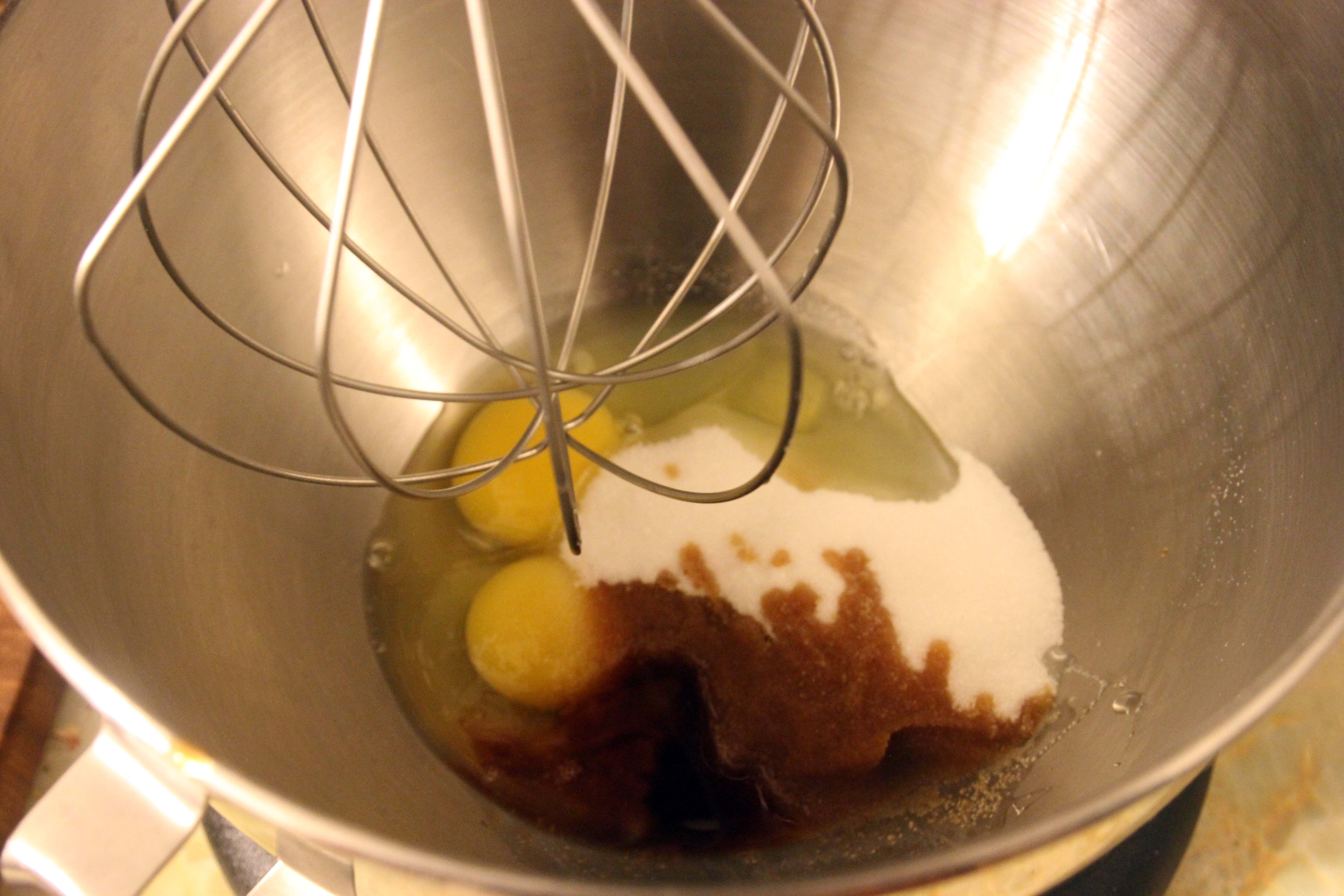 If you have a stand mixer, grab the bowl from that, and then add the sugar, eggs, and vanilla. If you don’t have a stand mixer, get ready to use arm muscle power for the next 10 mins!