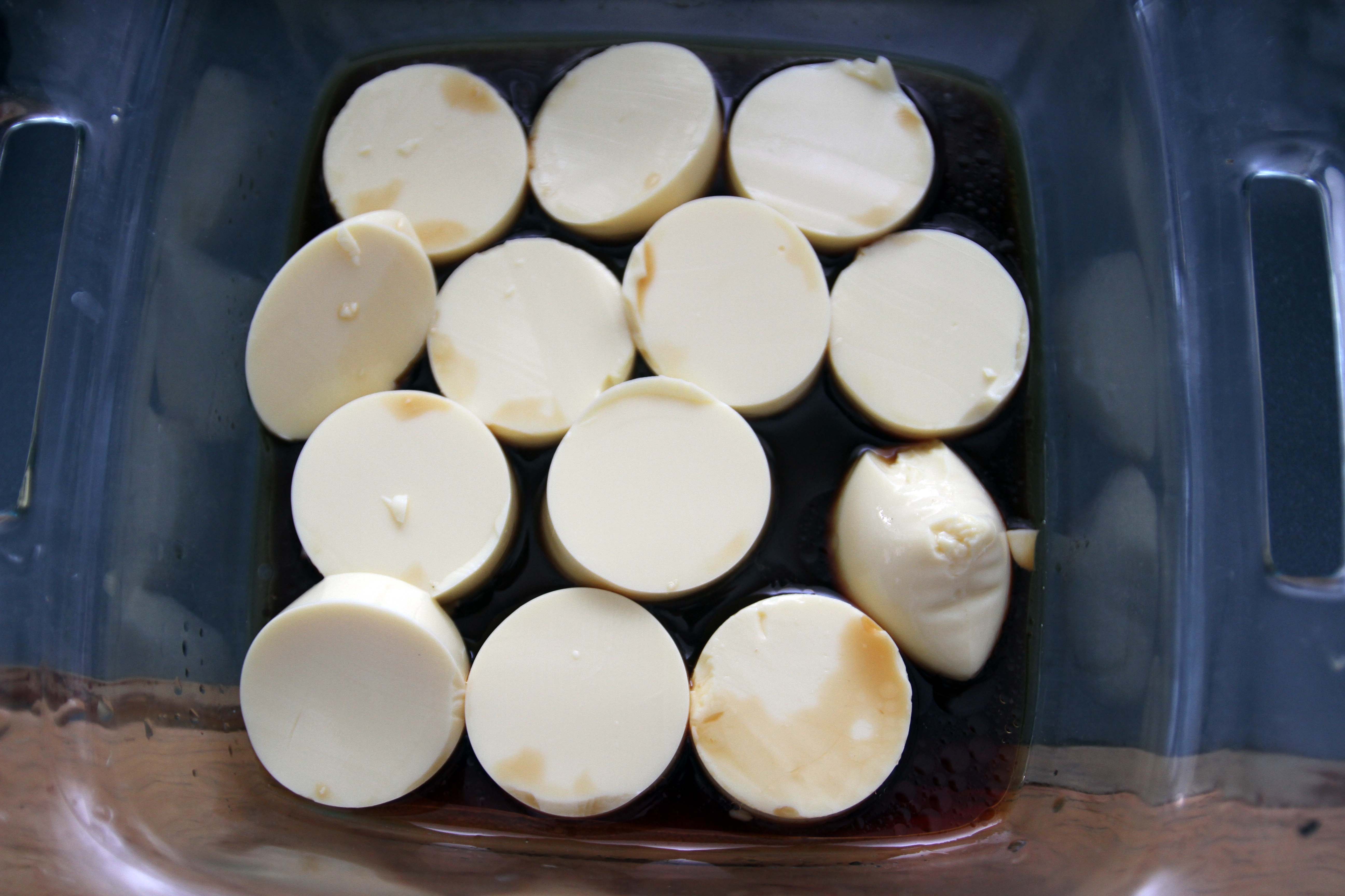 Create a marinade for your tofu by combining some sesame oil with soy sauce. Thin it down by adding a touch of water. Measurements? No clue. I always eyeball it and mix it to taste. Cut the tofu into slices, and place them in the mixture. Swish it around every 5 mins or so.