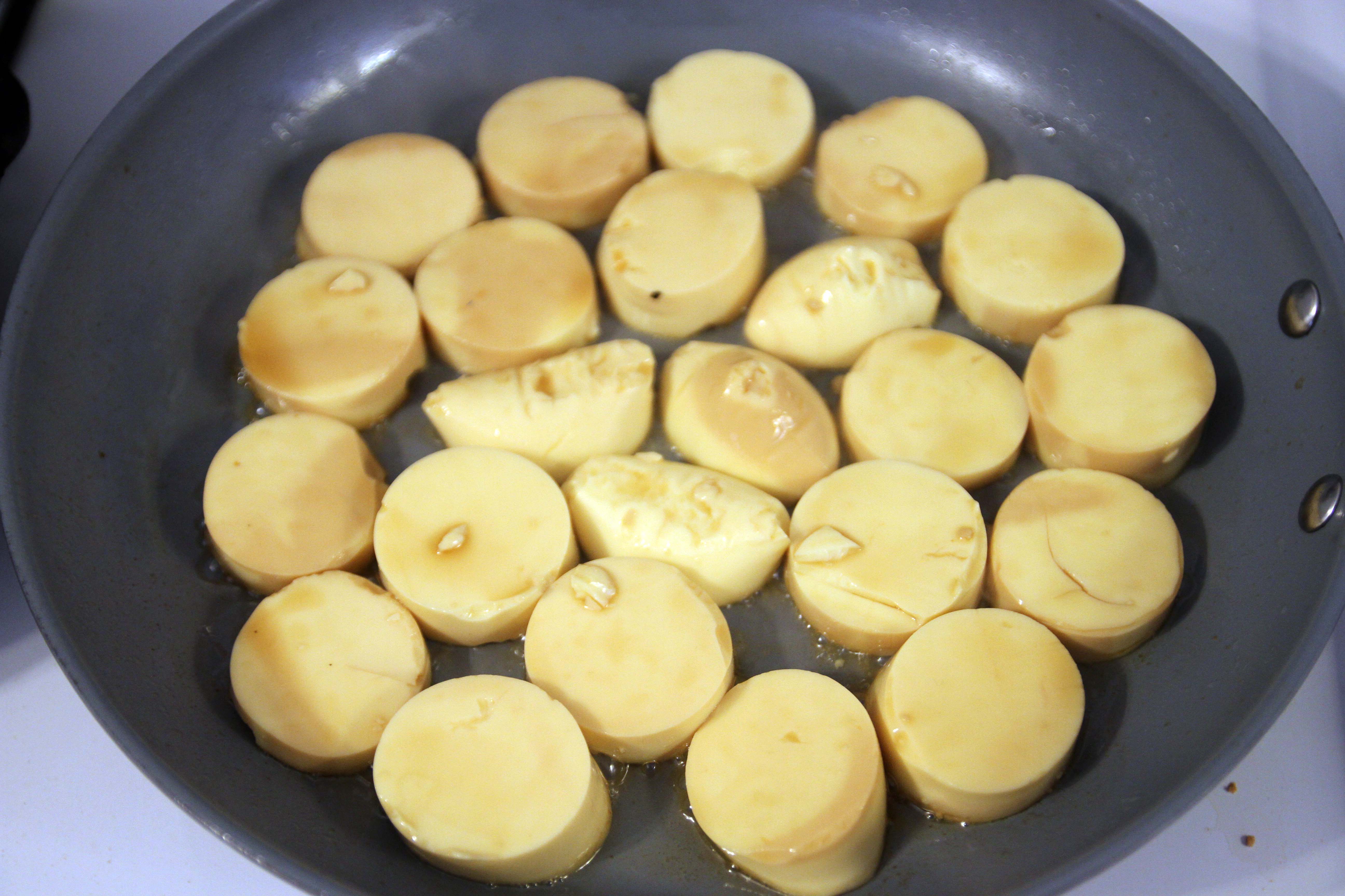 On another burner, get a non stick pan medium hot, and add some oil. Place your now marinated tofu on the frying pan, and brown each side.