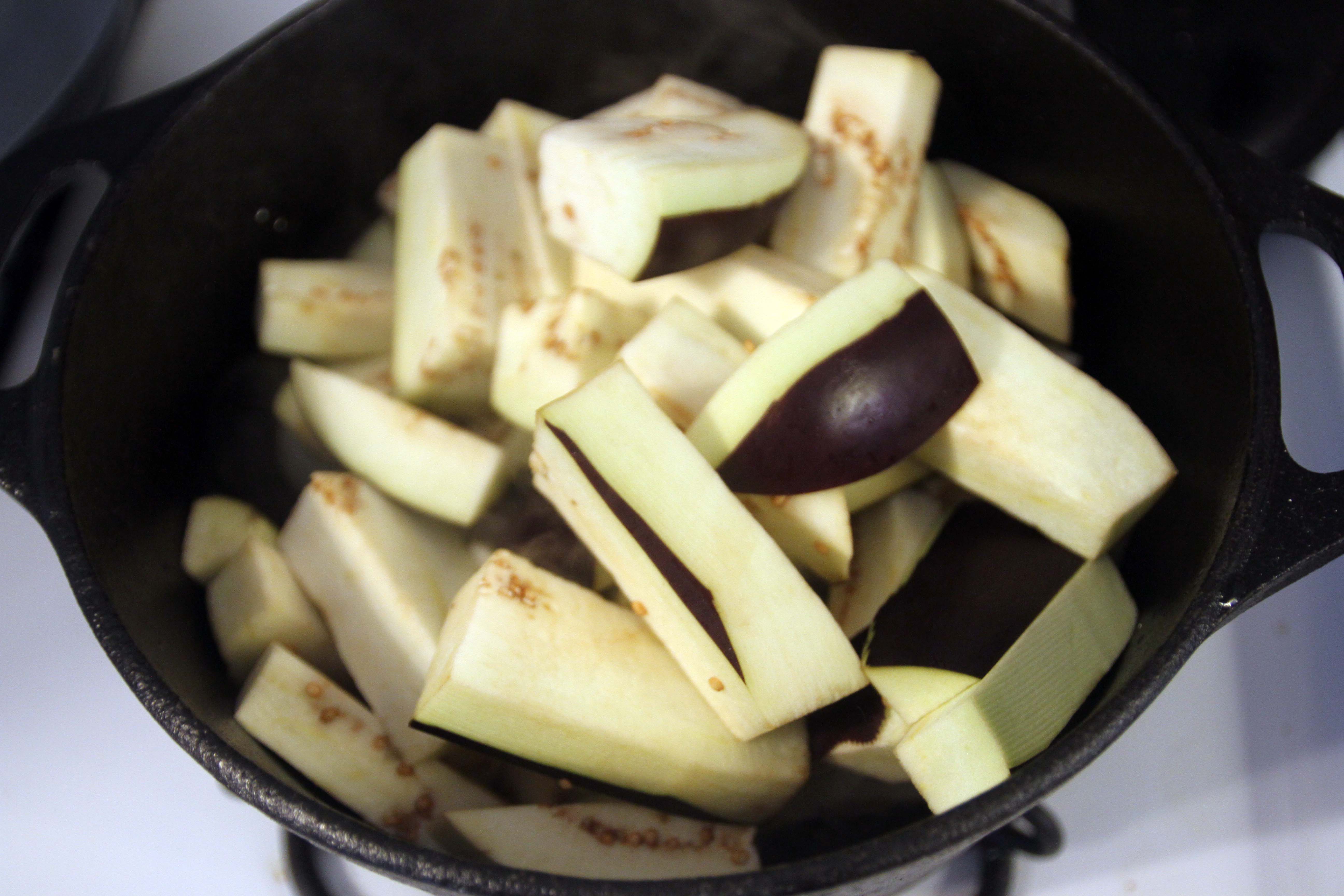 Chop the eggplant into rectangles, roughly 3 cm square, and 8 cm long. Heat a large pot with a cup of boiling water, and place the eggplant in it.
