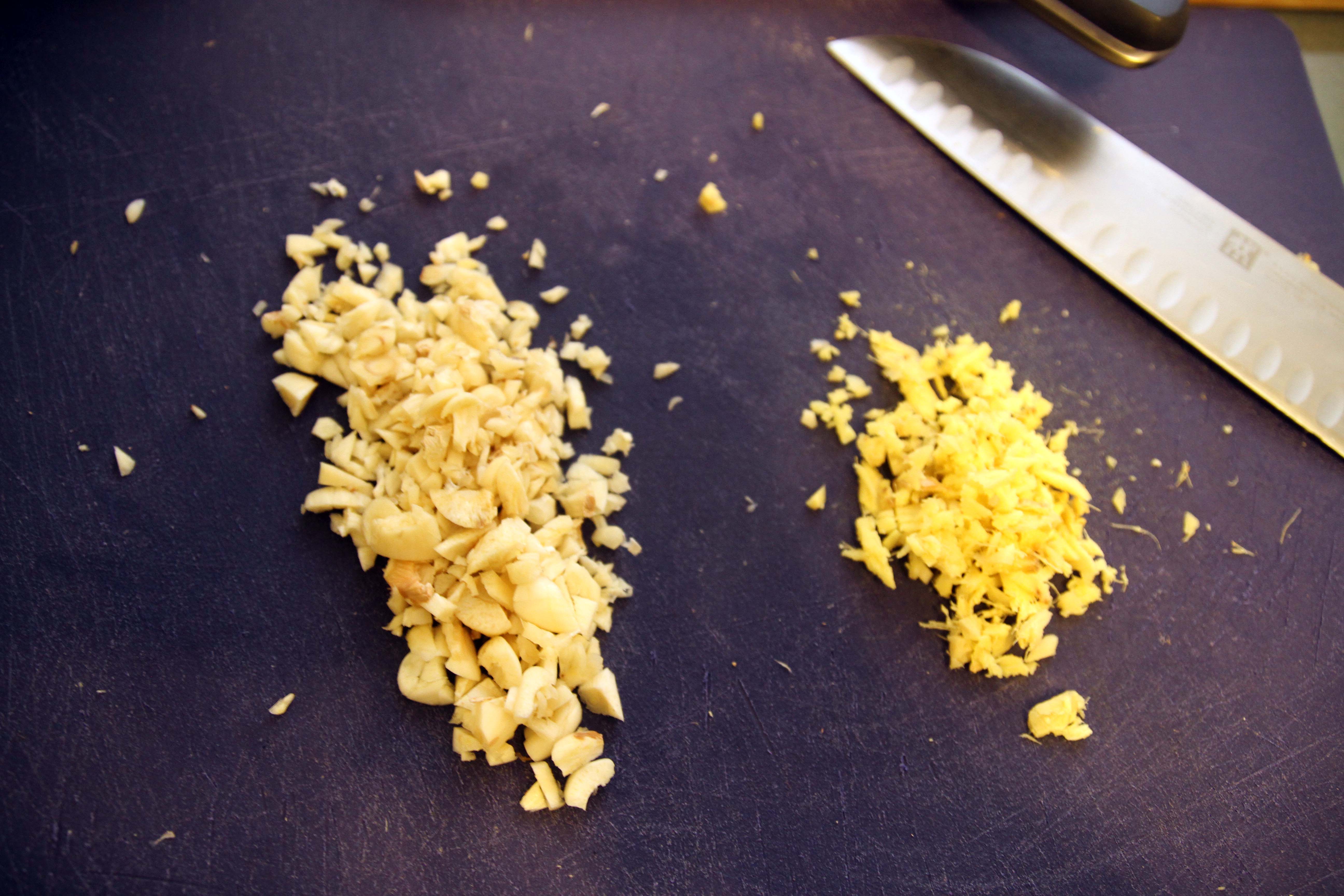 Give the marinating tofu another swish. Prep the garlic and ginger but mincing each.