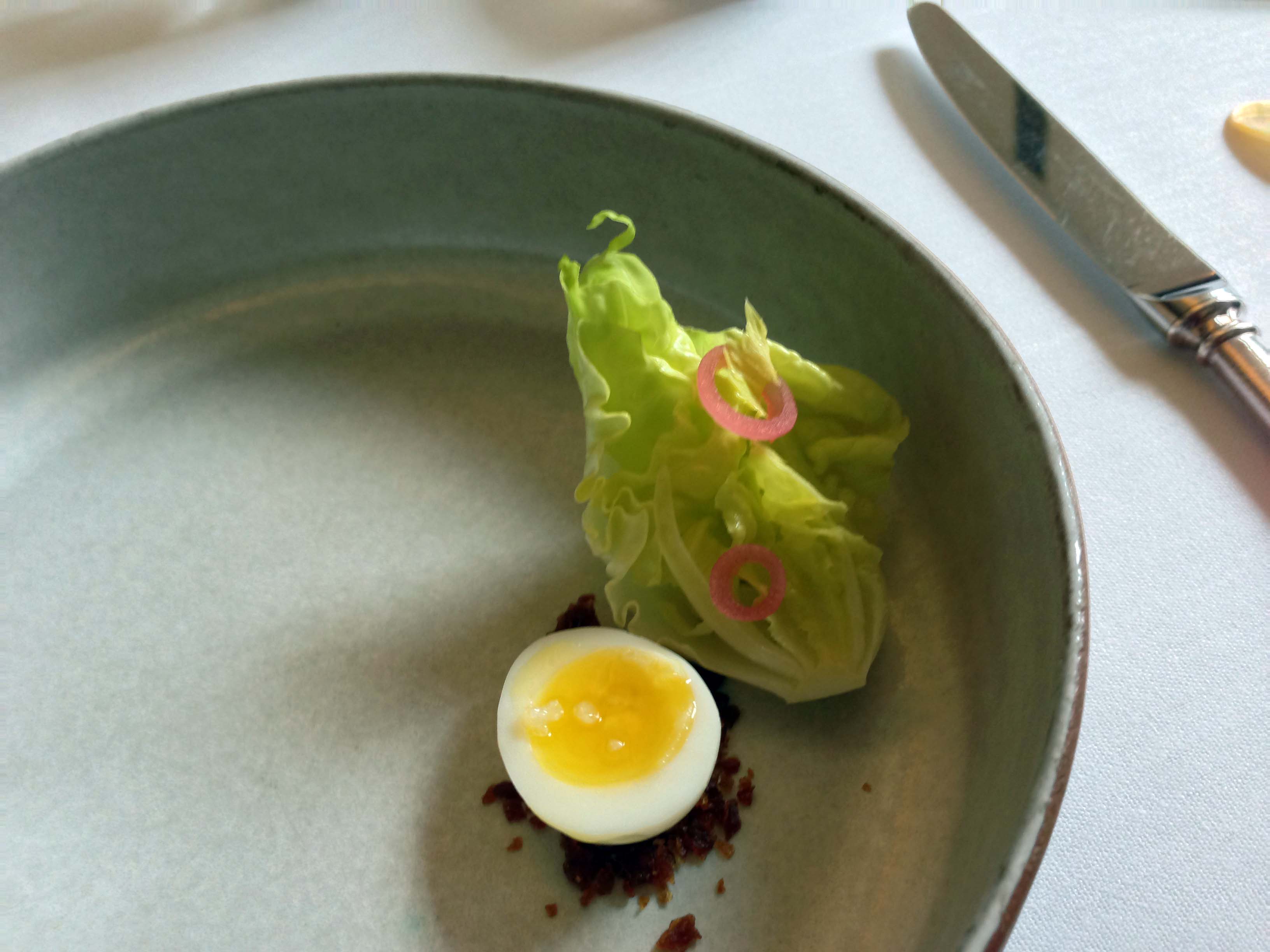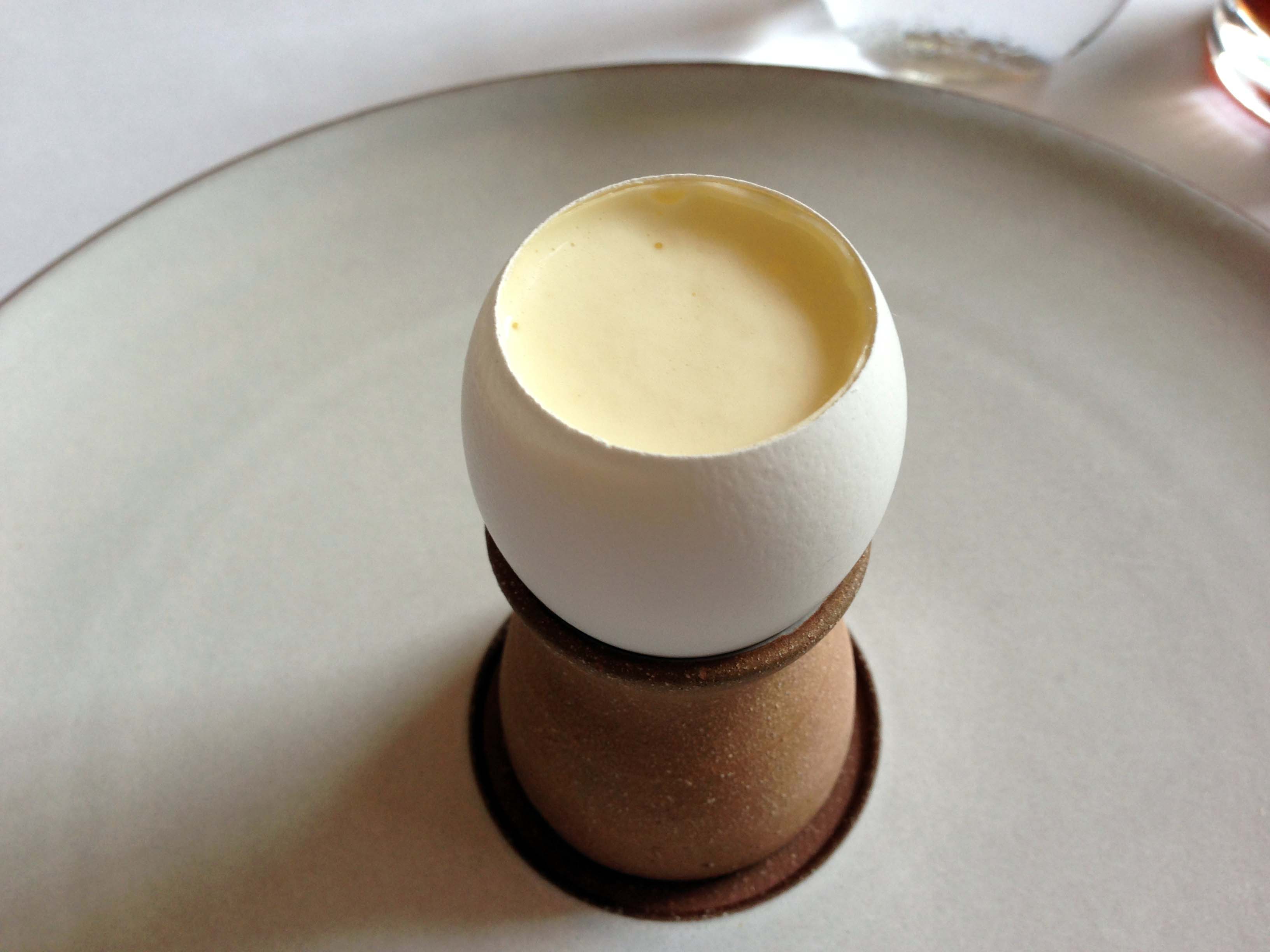 The next dish, the Sturgeon came out. The Sabayon with Chive Oil was my favourite. I actually have now acquired a tool to cut eggs perfectly, as shown below 🙂