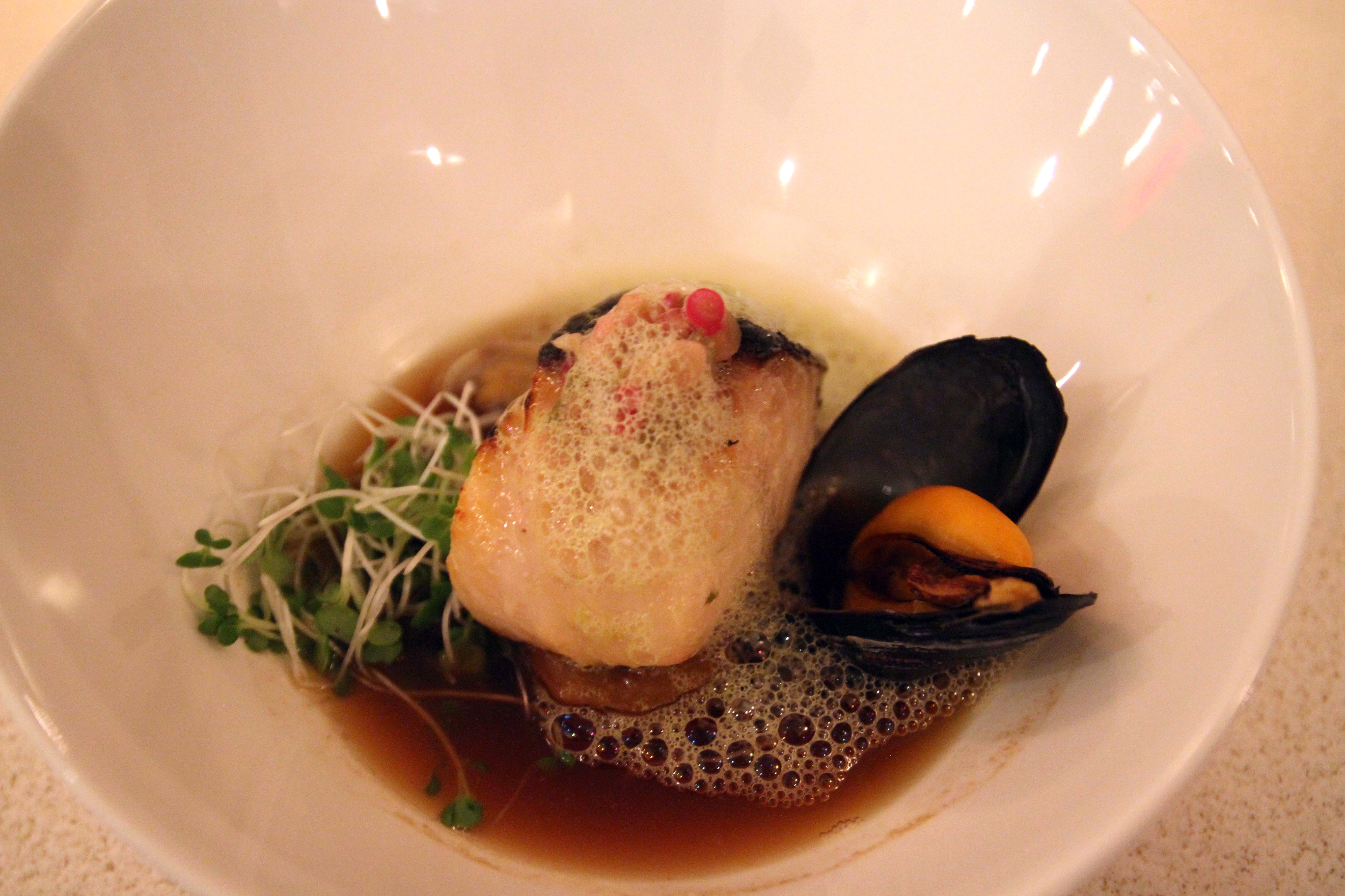 The next course that awaited us was the cooked fish round. Sablefish with eggplant in dashi, with shiso foam. Yeah, they didn’t go full-on fusion with this dish or anything! While foam is impressive to look at, it really doesn’t do anything for the dish taste wise. It’s a good thing the sablefish and dashi were more than strong enough to stand on their own! Jax’s favourite part of this dish was the eggplant. I loved the dashi. The sablefish was moist, and light — but we both loved the accompaniments more!